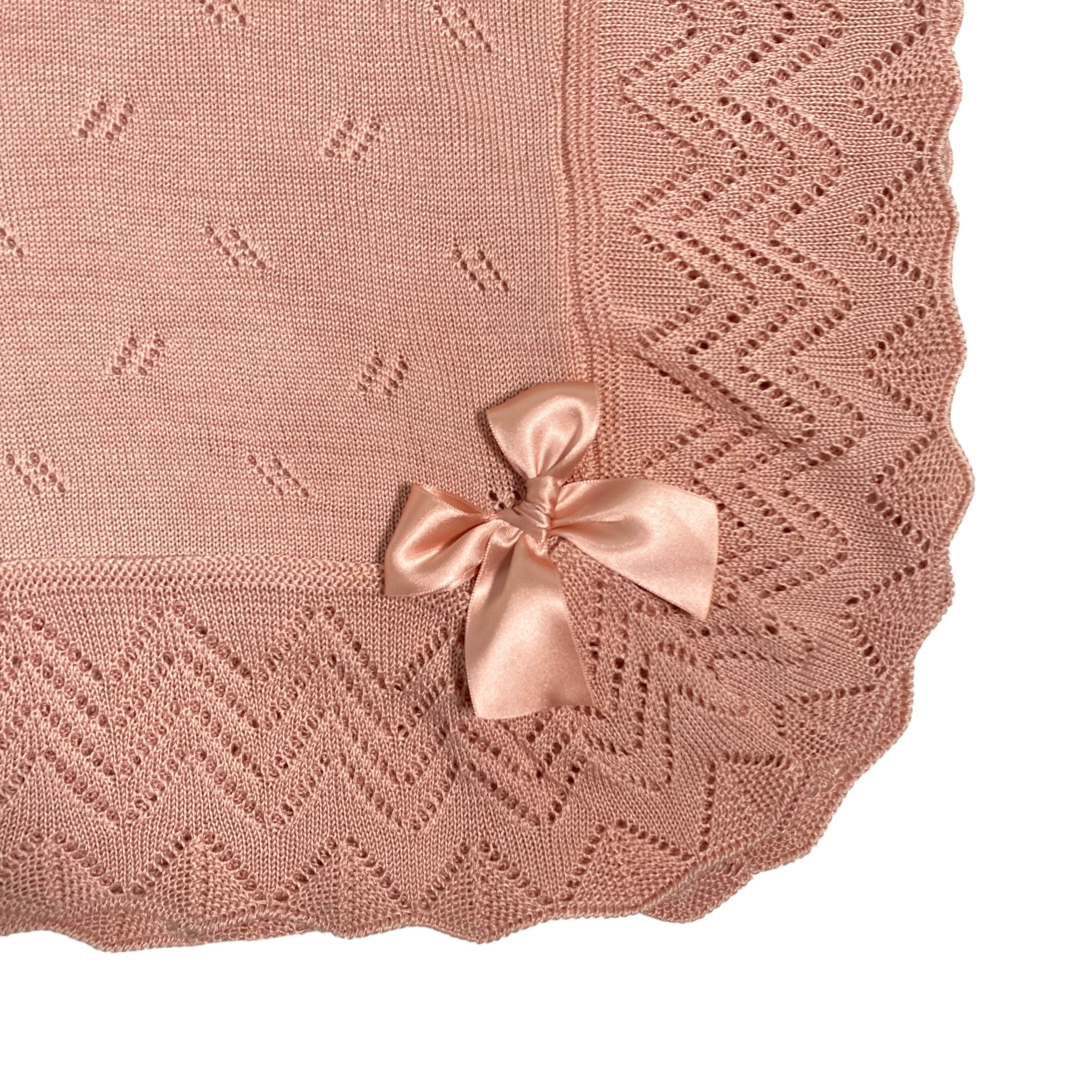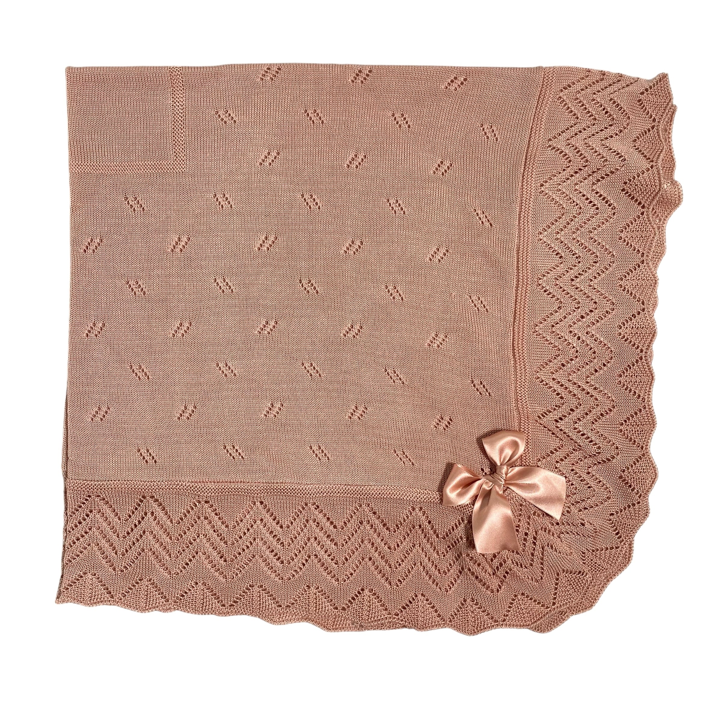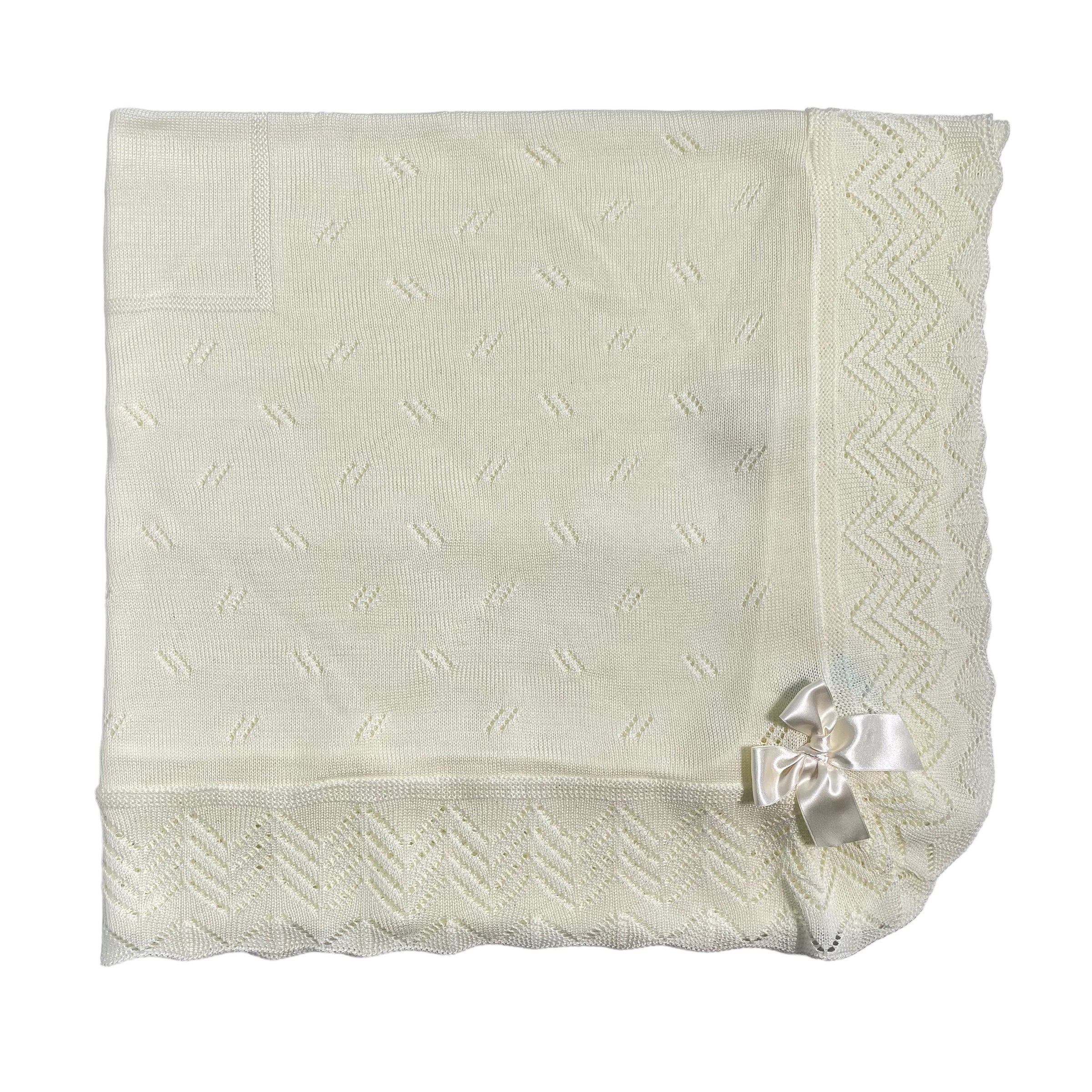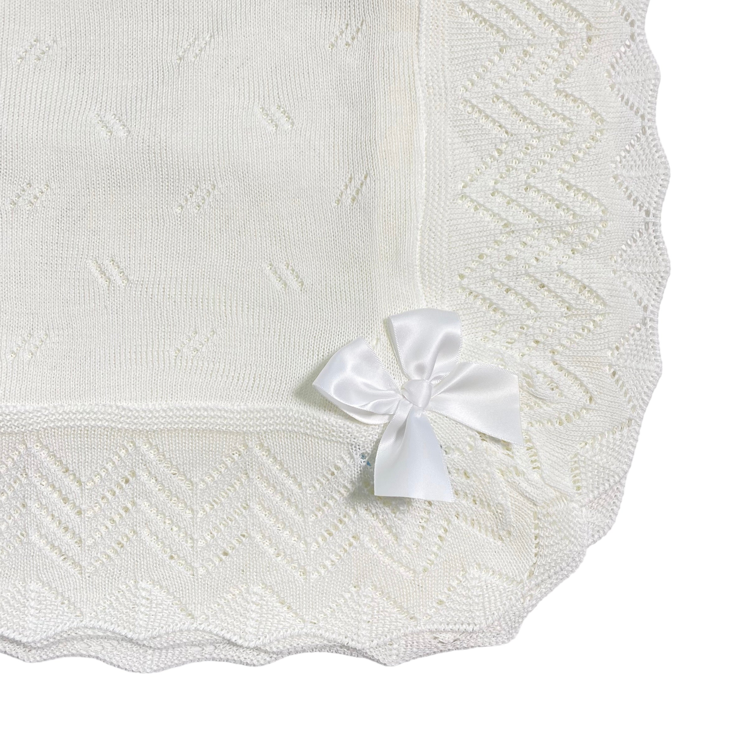 Proteggi il tuo neonato con stile, con la nostra coperta elegante in tessuto anallergico acrilico. Perfetta per tenere il tuo piccolo/a caldo/a e confortevole, grazie alla sua lavorazione traforata e al fiocco in raso che lo rende ancora più elegante.