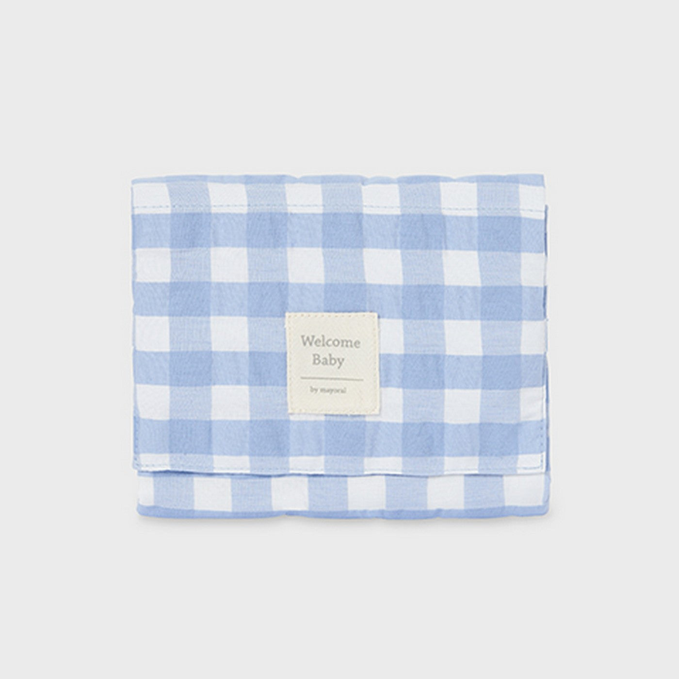 Tragbarer Wickeltisch aus kariertem Stoff.