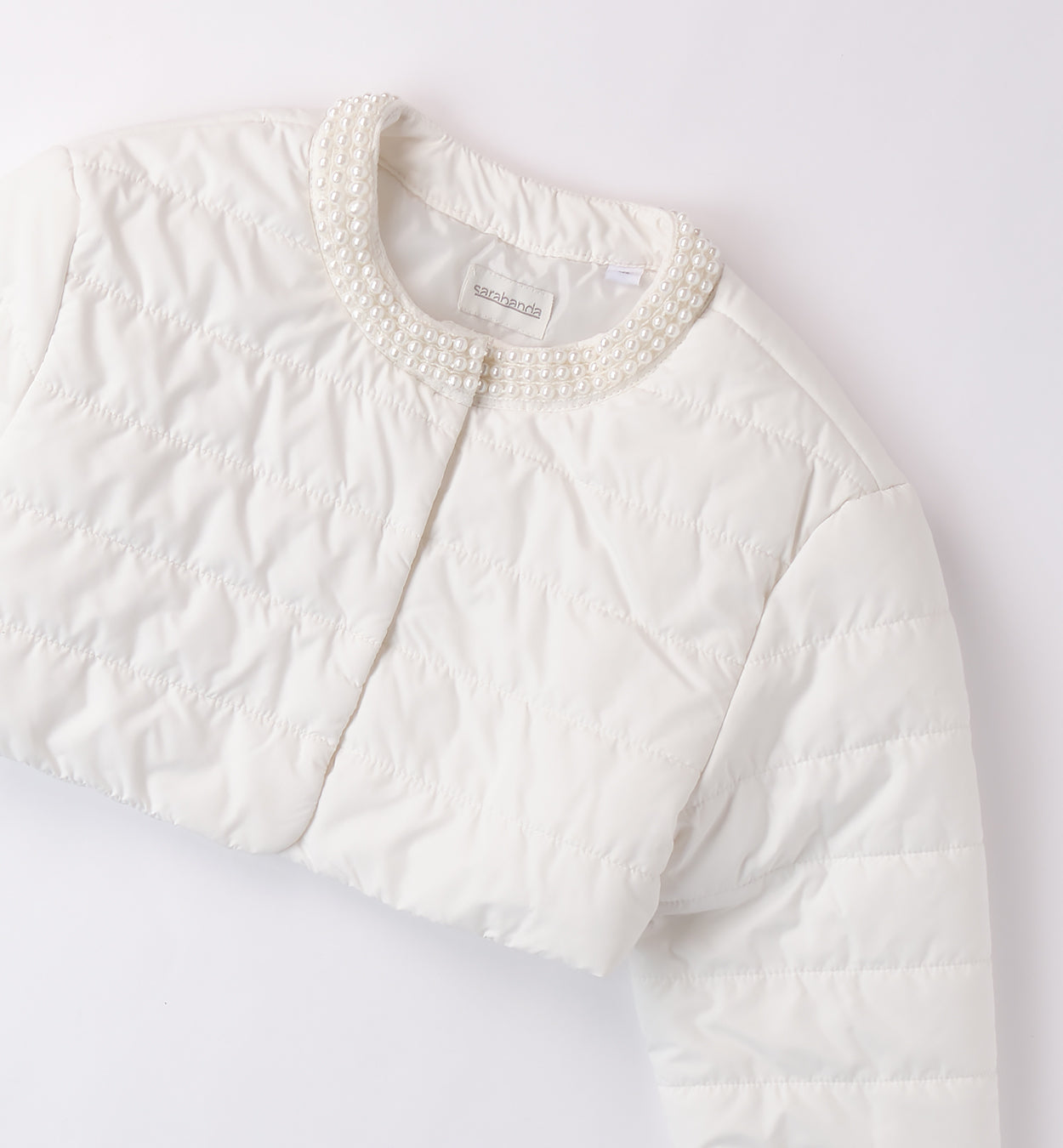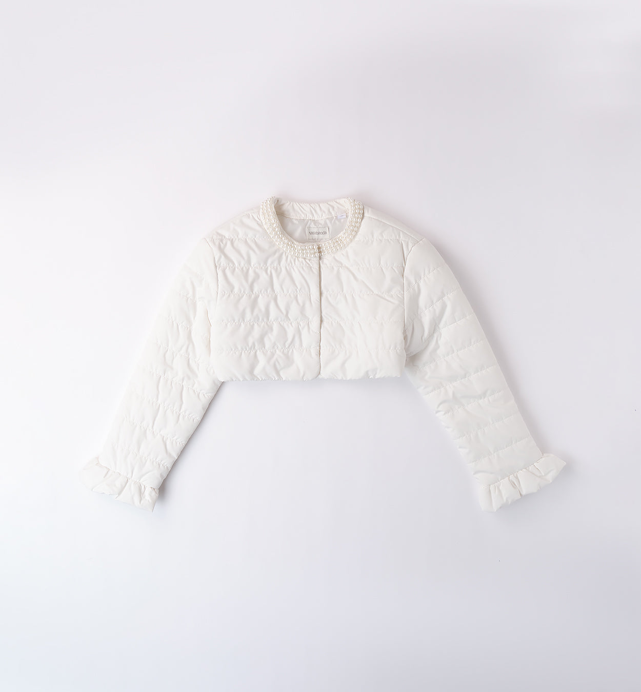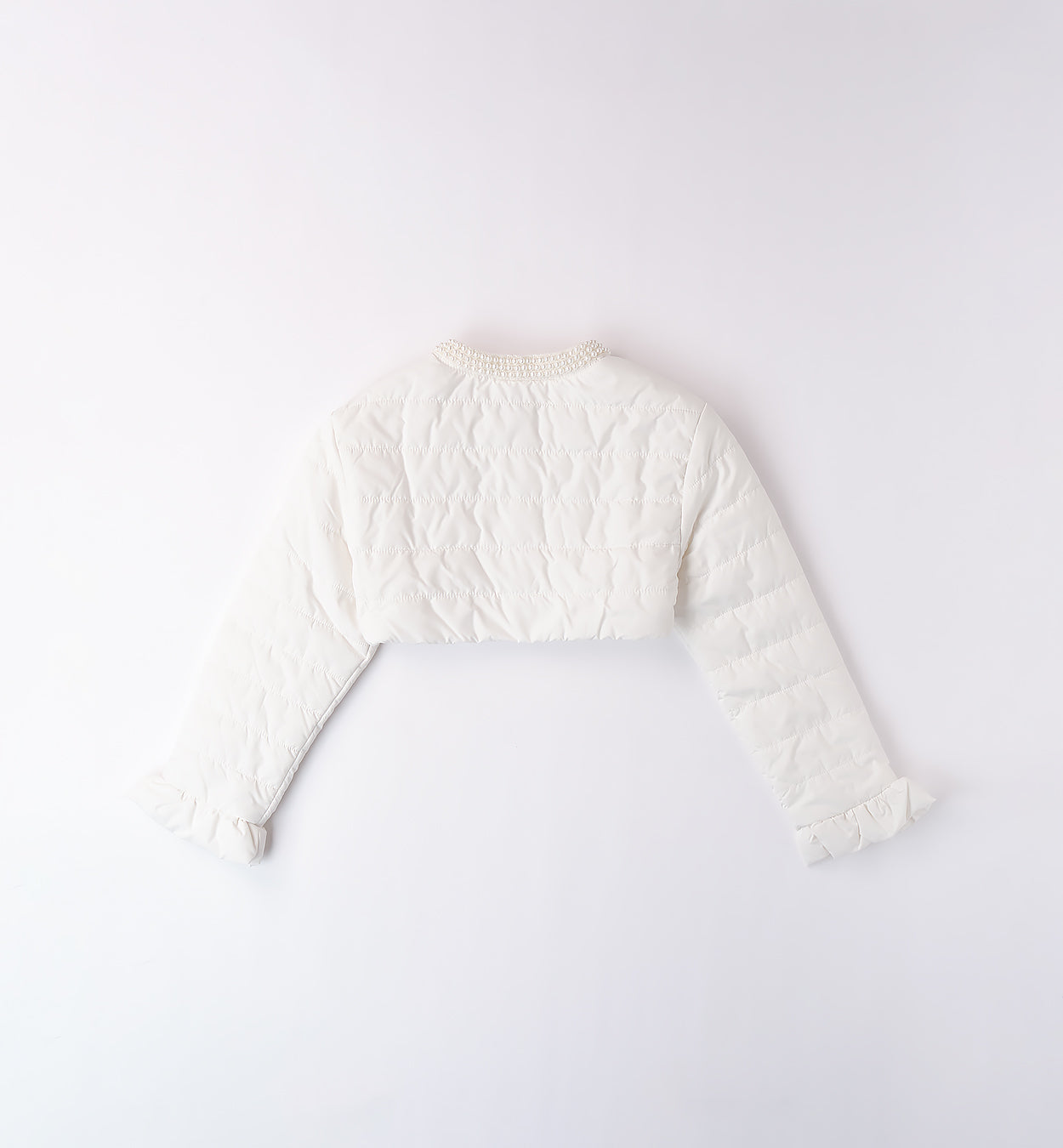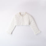 L'ultima tendenza per le ragazze più eleganti: il giubbotto trapuntino corto bianco con perle e dettagli rouches. Chiusura con comodi bottoni a pressione e fodera interna per maggiore calore. Disponibile in misure per bambine, perfetto per un look chic e alla moda.