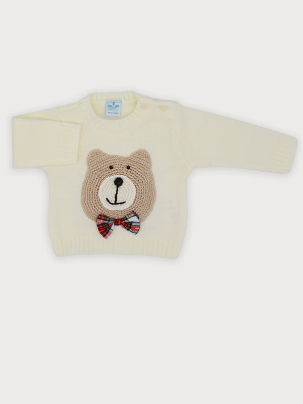 Questo morbidissimo maglioncino in tessuto anallergico acrilico offre comfort e calore ideali per il neonato. Il delicato ricamo a forma di orso aggiunge un tocco di eleganza senza rinunciare alla praticità, rendendolo perfetto per proteggere i più piccoli dalle temperature più fresche con stile e sicurezza.
