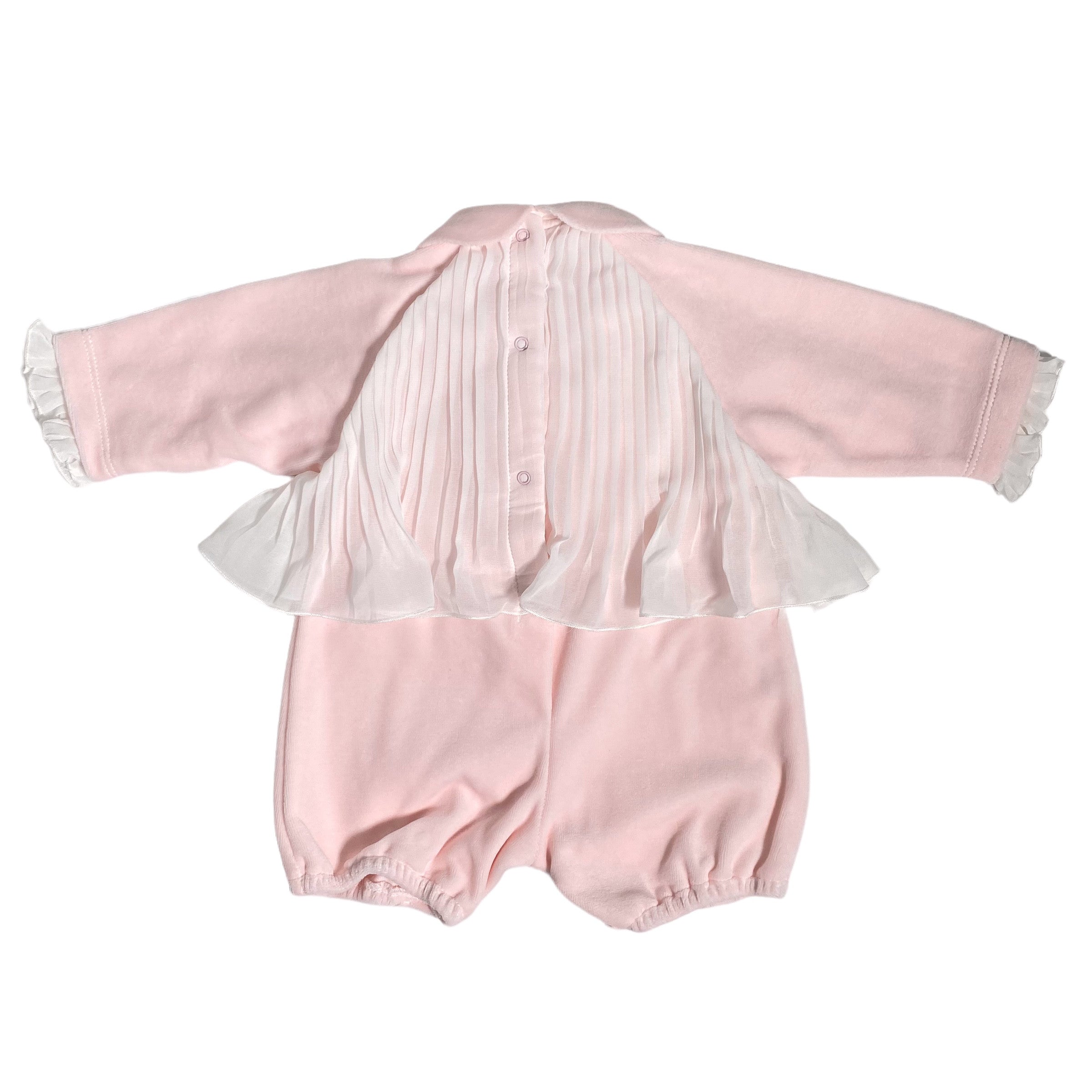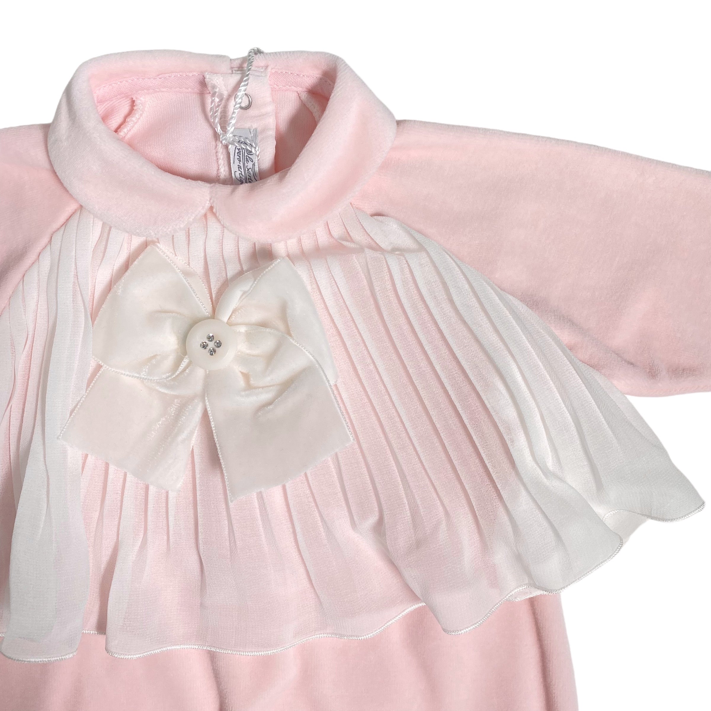Strampler aus rosa Chenille, mit plissierter Organza-Applikation am Oberteil und rosa Samtschleife.