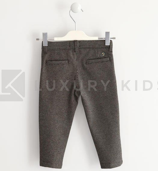 Weiche und warme Sarabanda-Hose mit Mikro-Hahnentrittmuster. Das Modell ist schmal geschnitten. Die Taille ist mit elastischen Knopflöchern und innenliegenden Knöpfen verstellbar