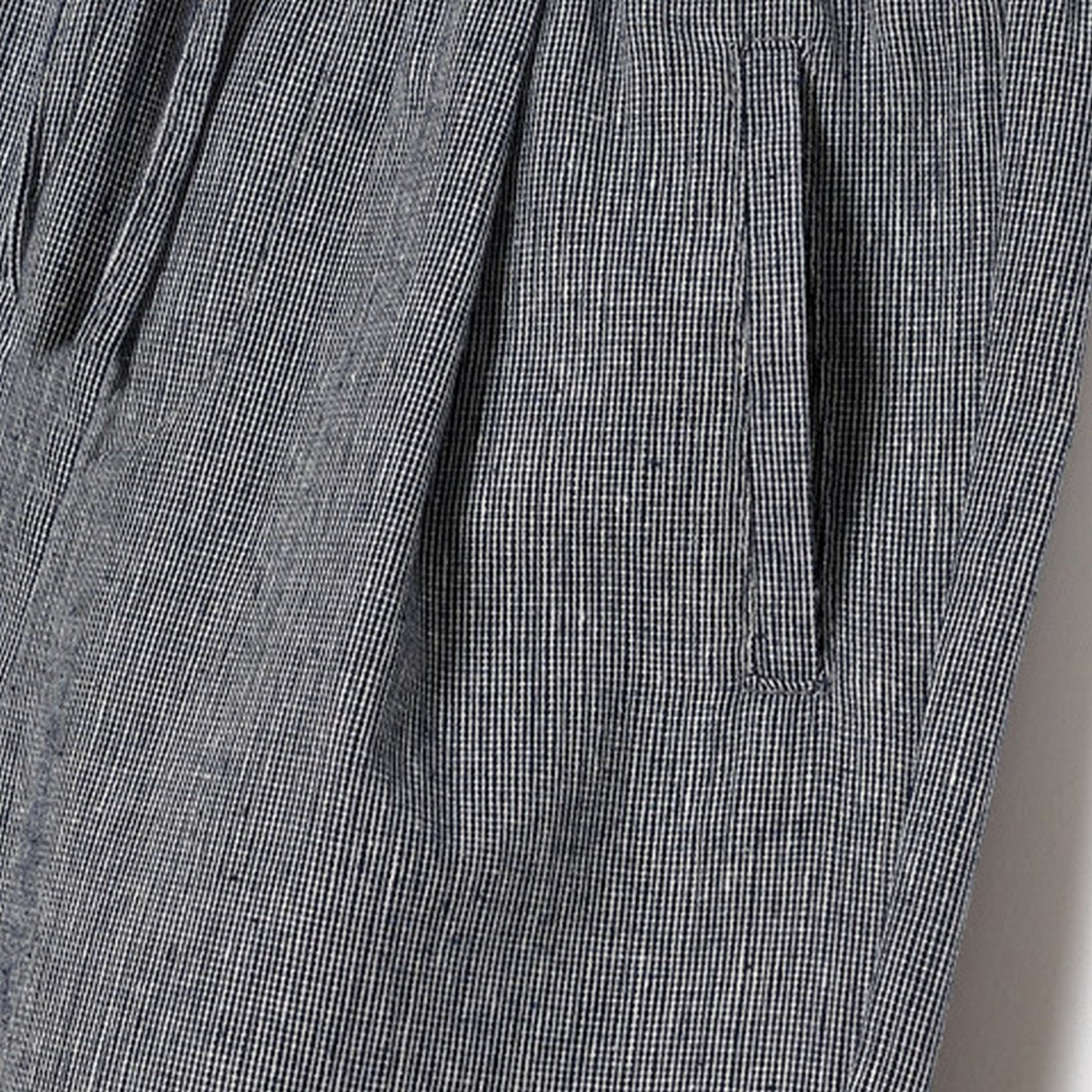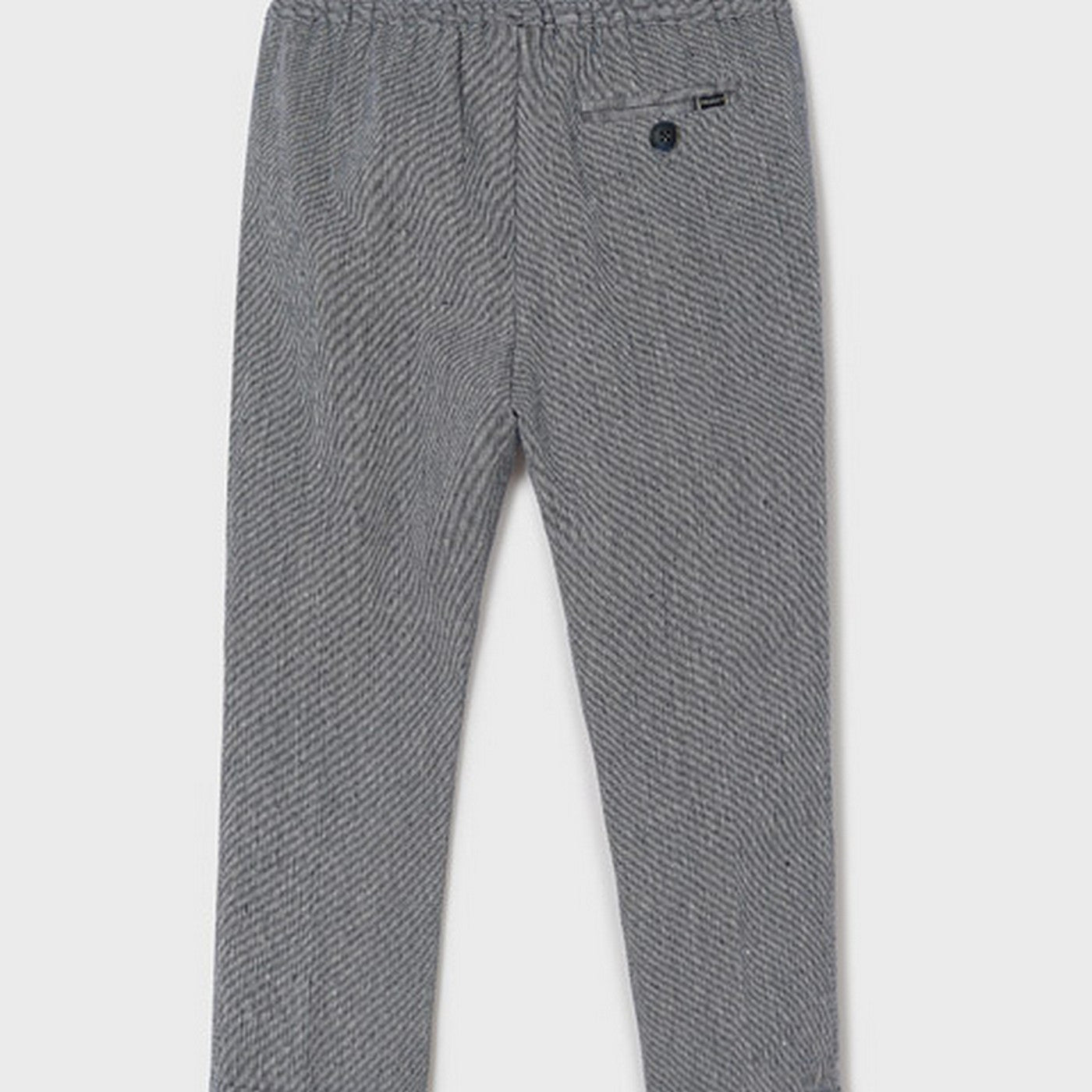 Lange blau gestreifte Hose mit elastischem Bund und Seitentaschen.