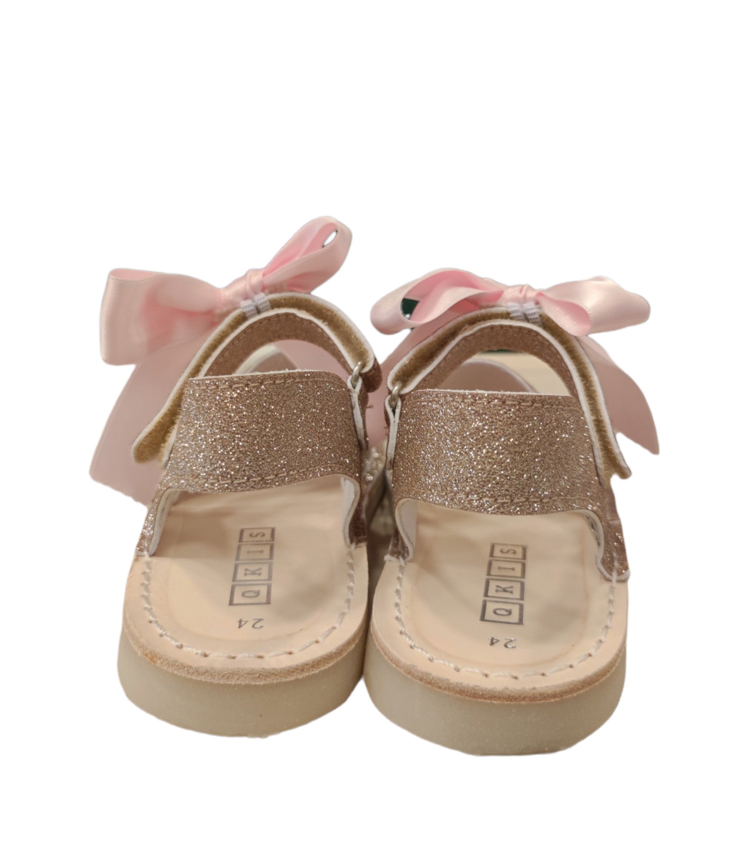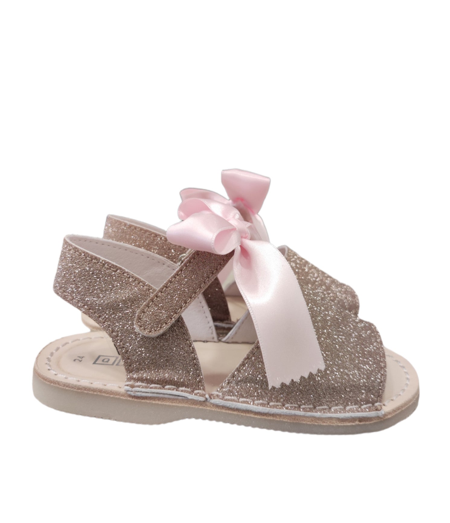Glitzersandalen, Öffnung auf dem Spann mit einem Riss und verziert mit einer Satinschleife. Frontöffnung