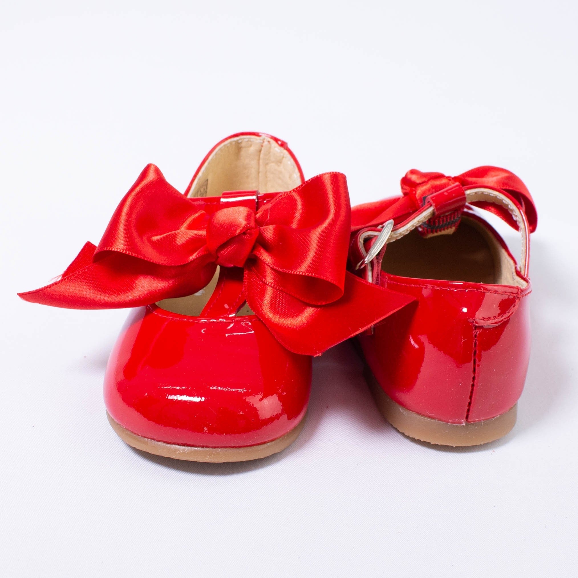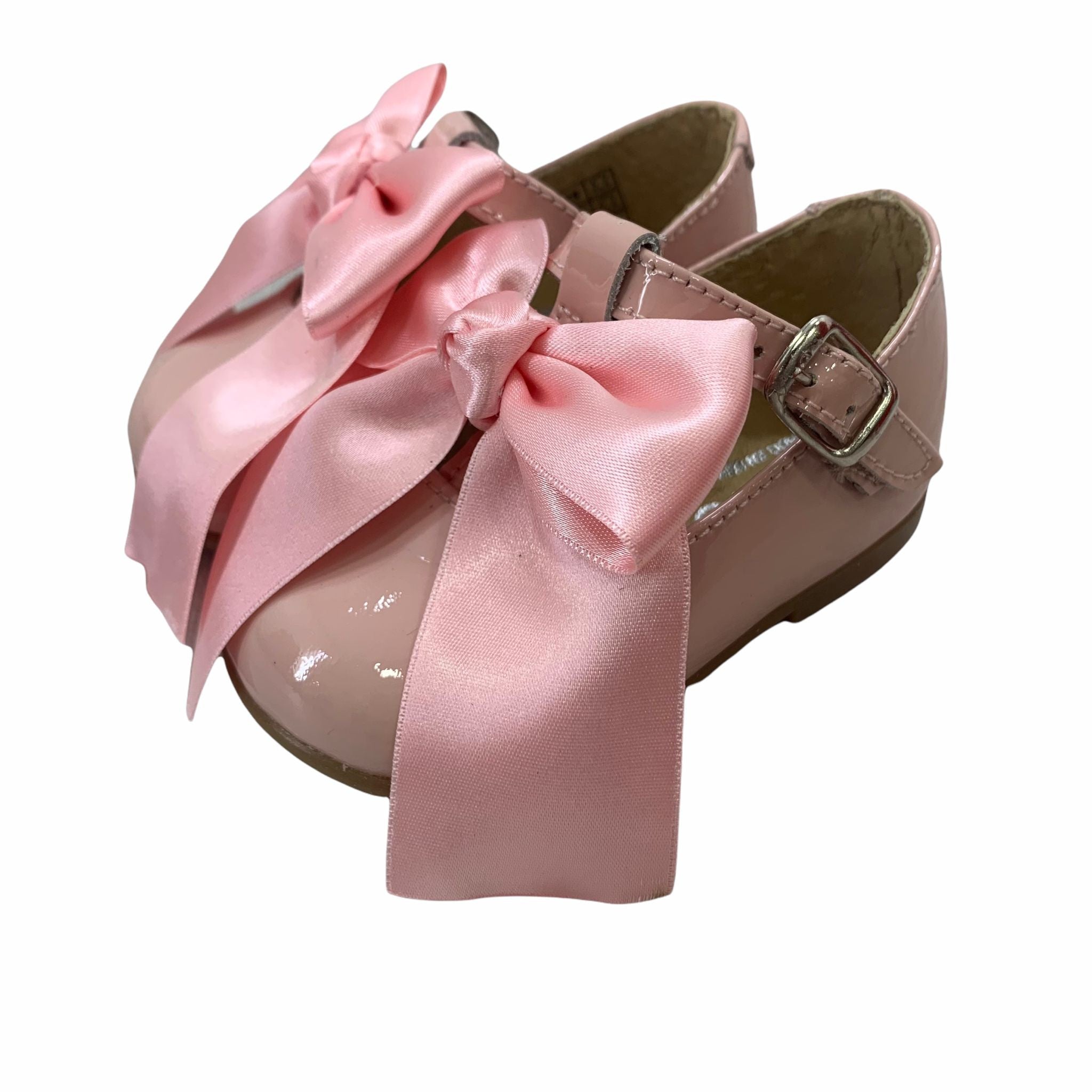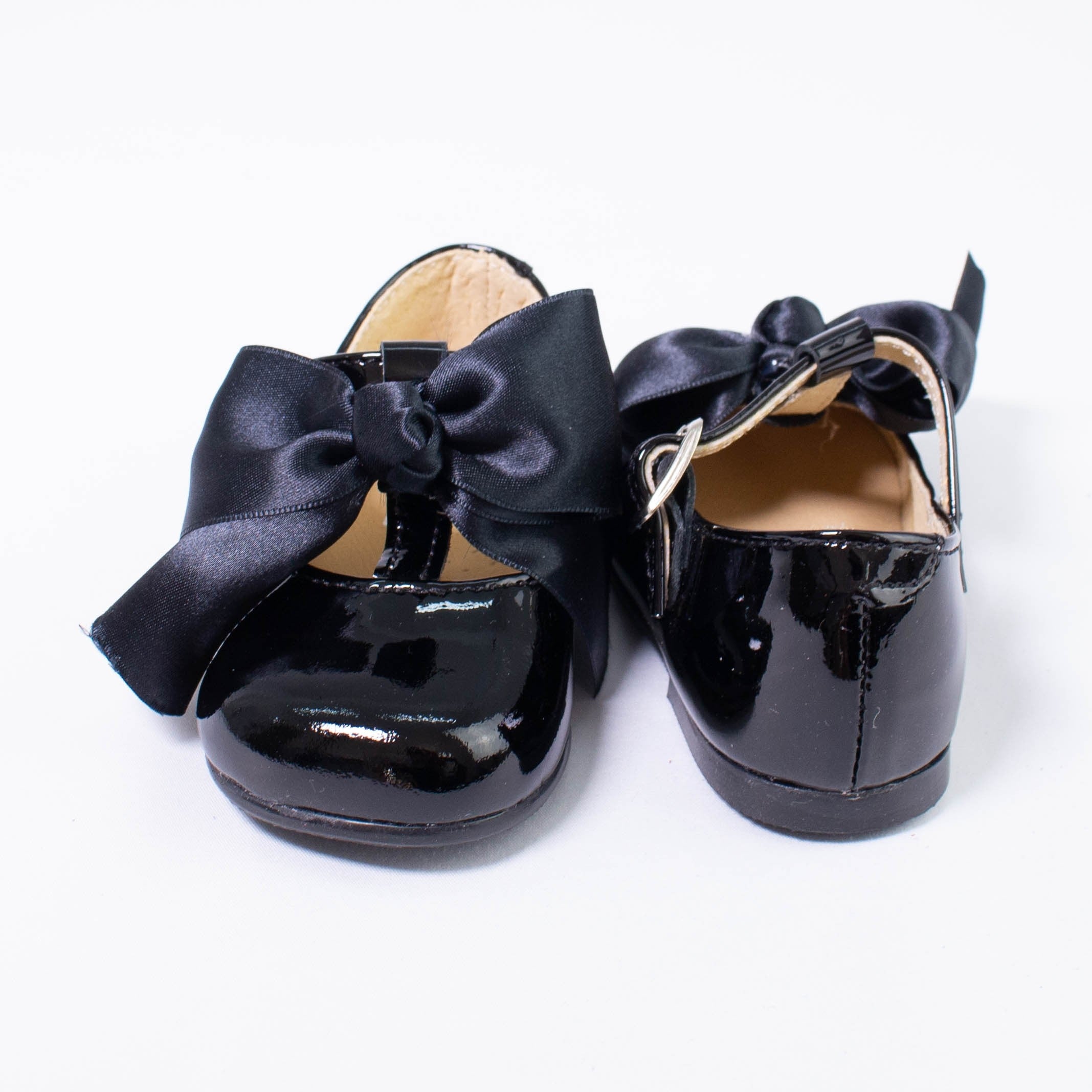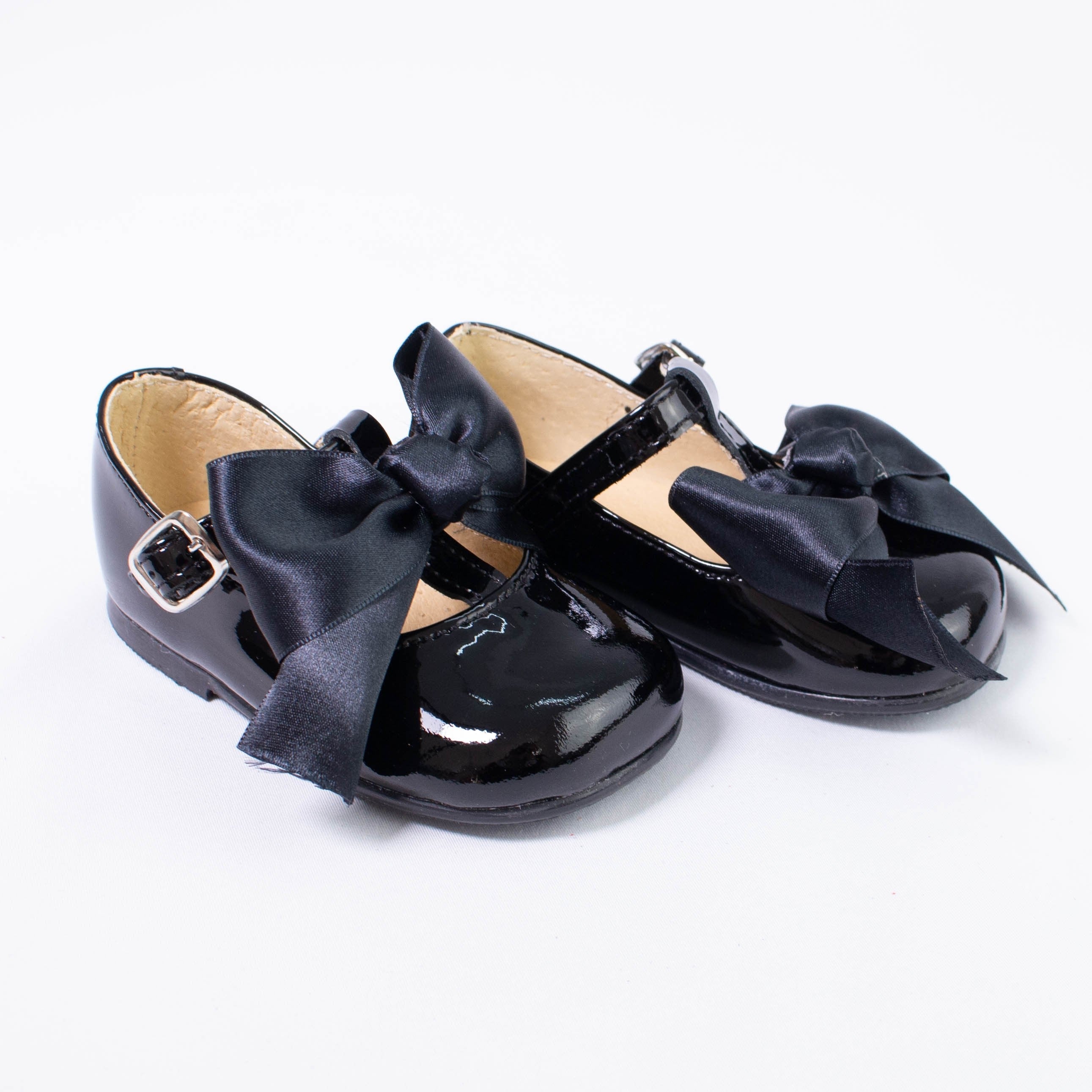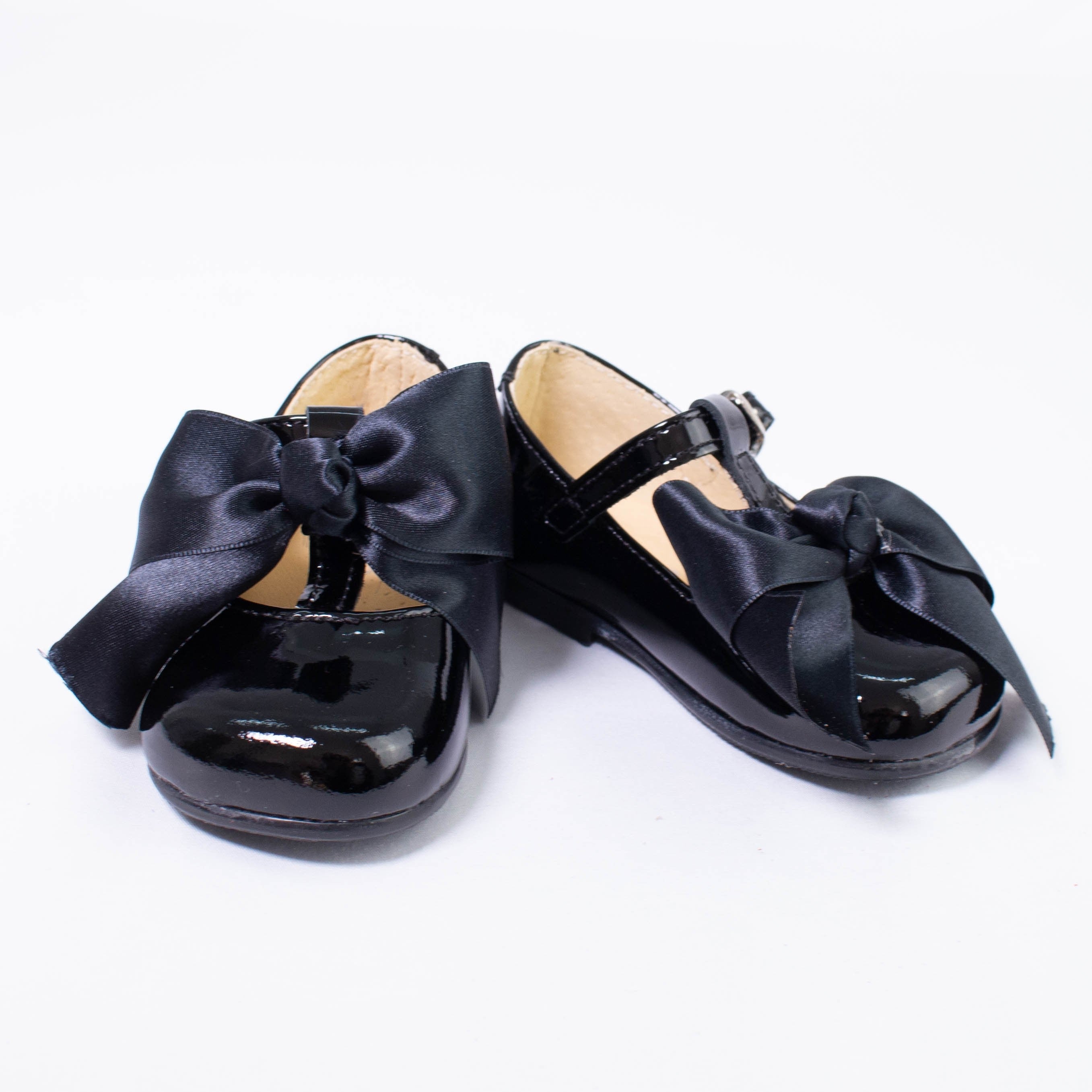 Lacklederschuh mit abnehmbarer Schleife vorne und Riemenverschluss.