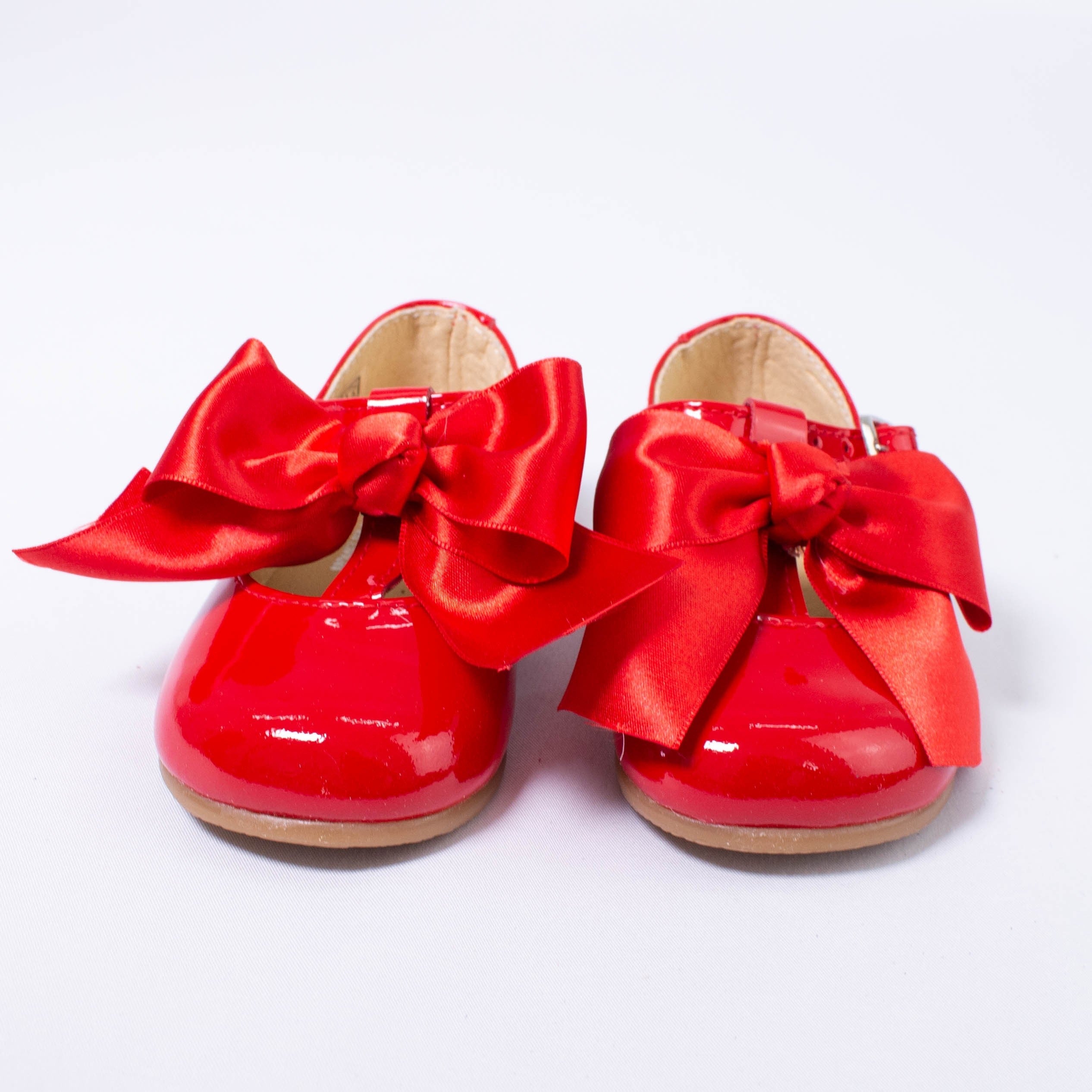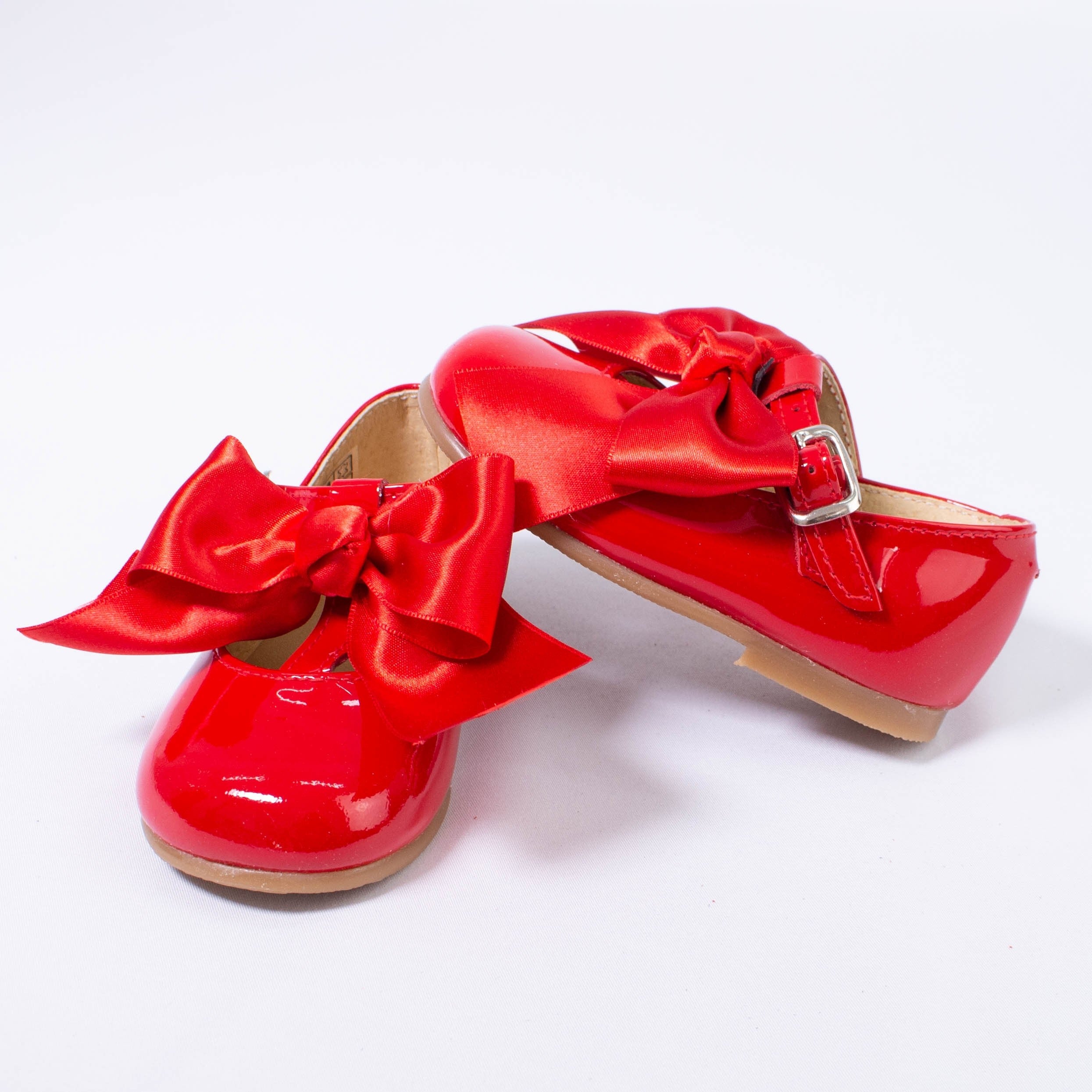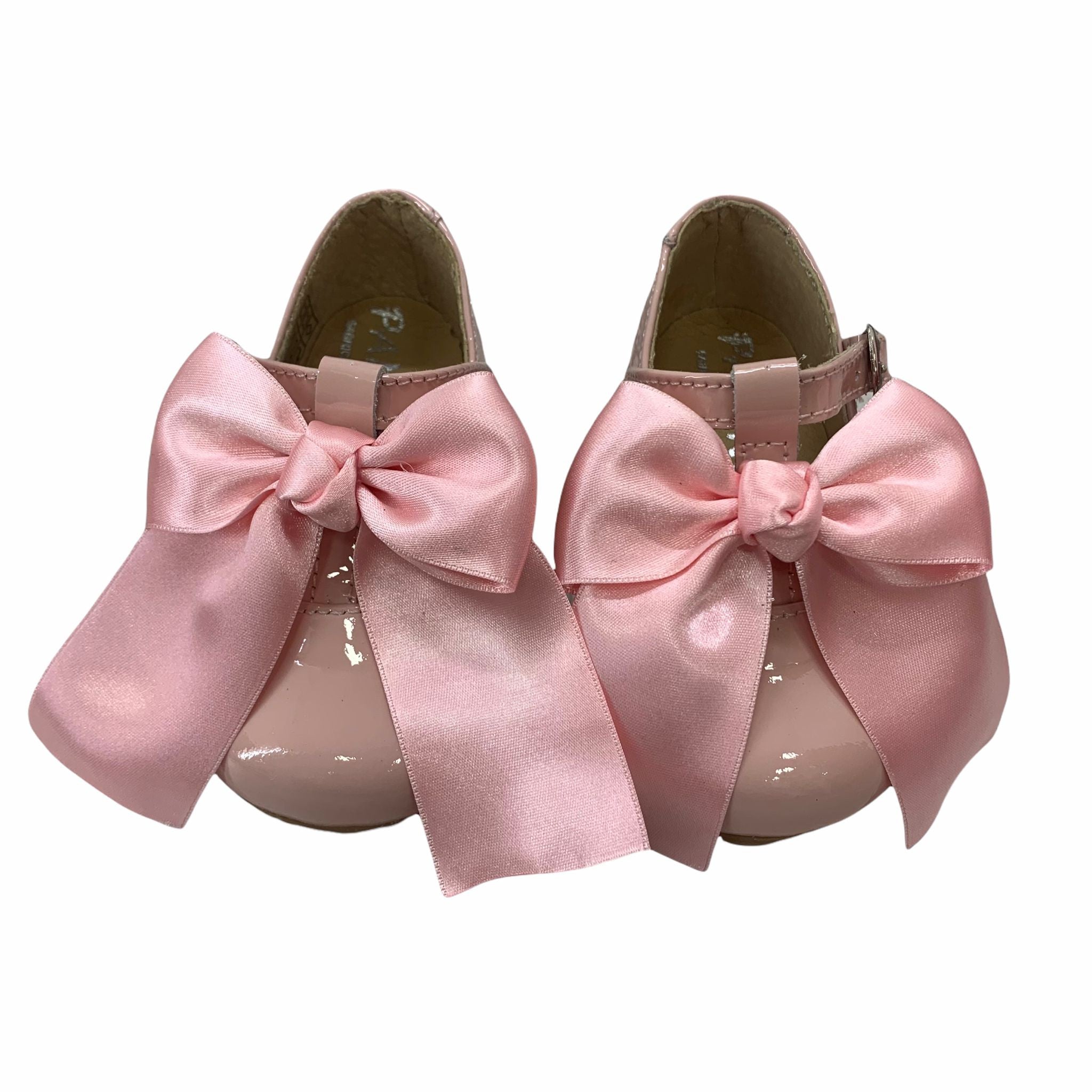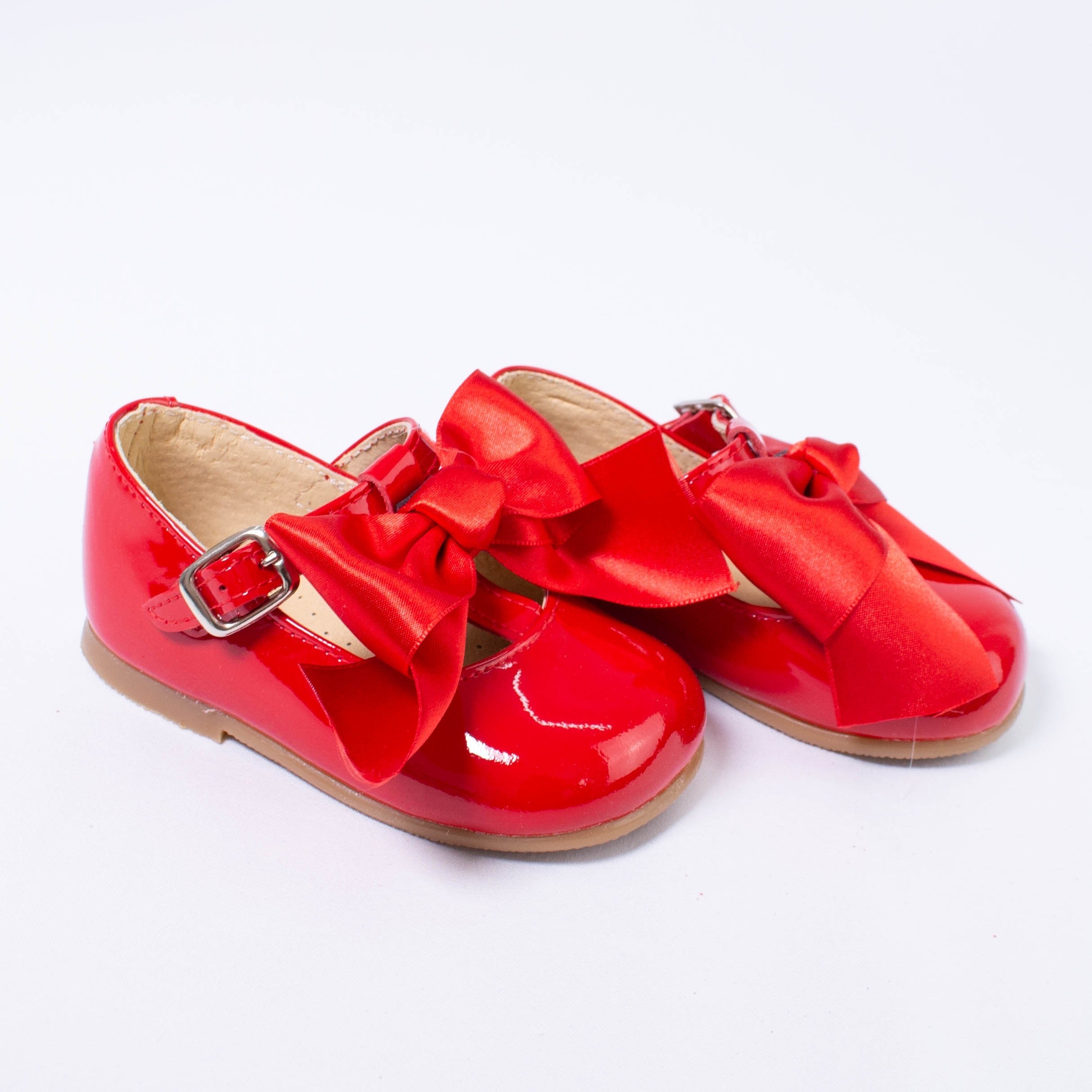 Lacklederschuh mit abnehmbarer Schleife vorne und Riemenverschluss.
