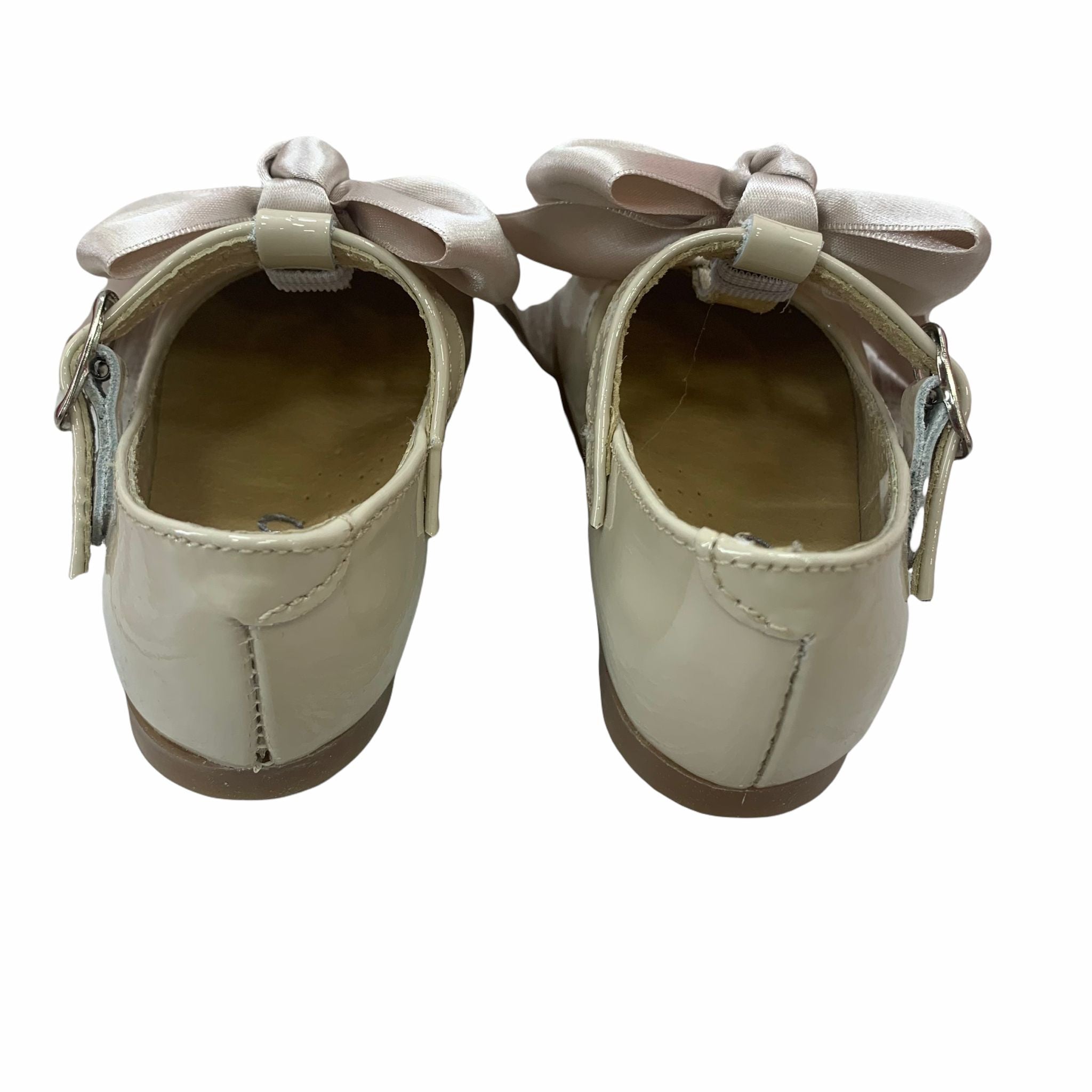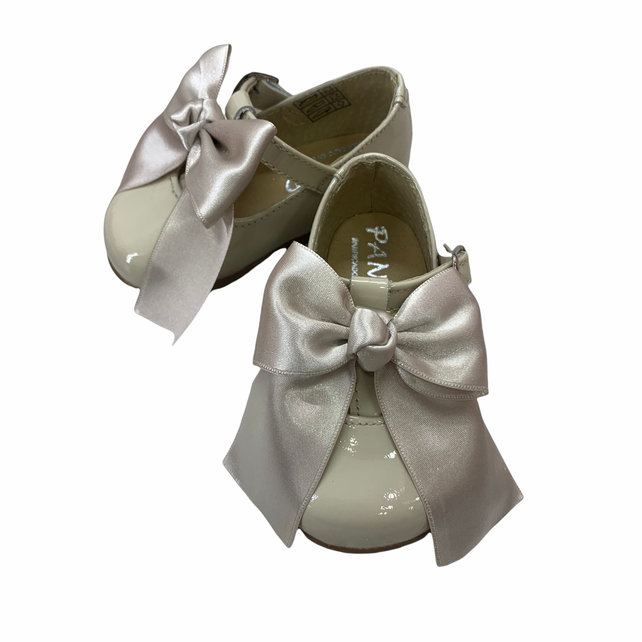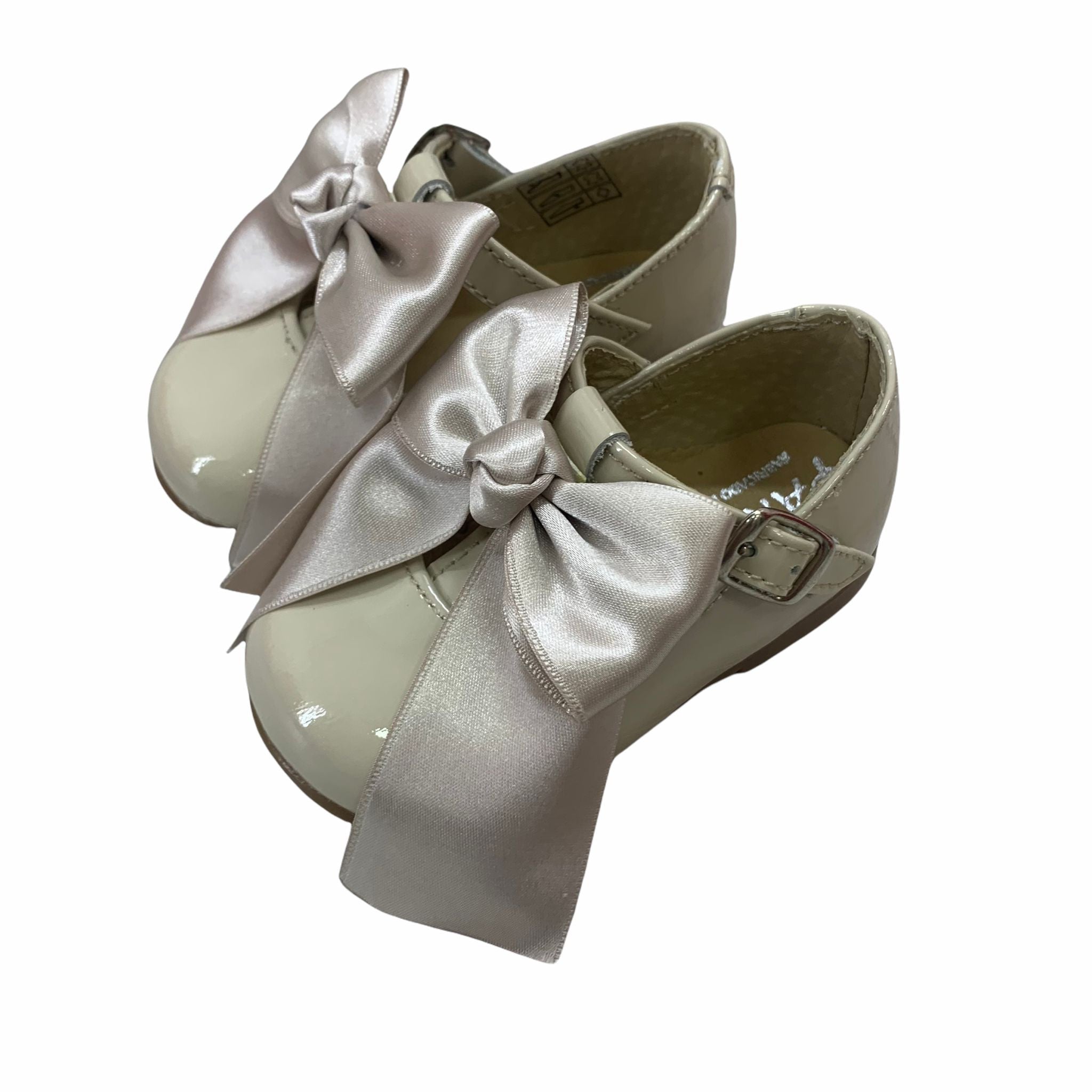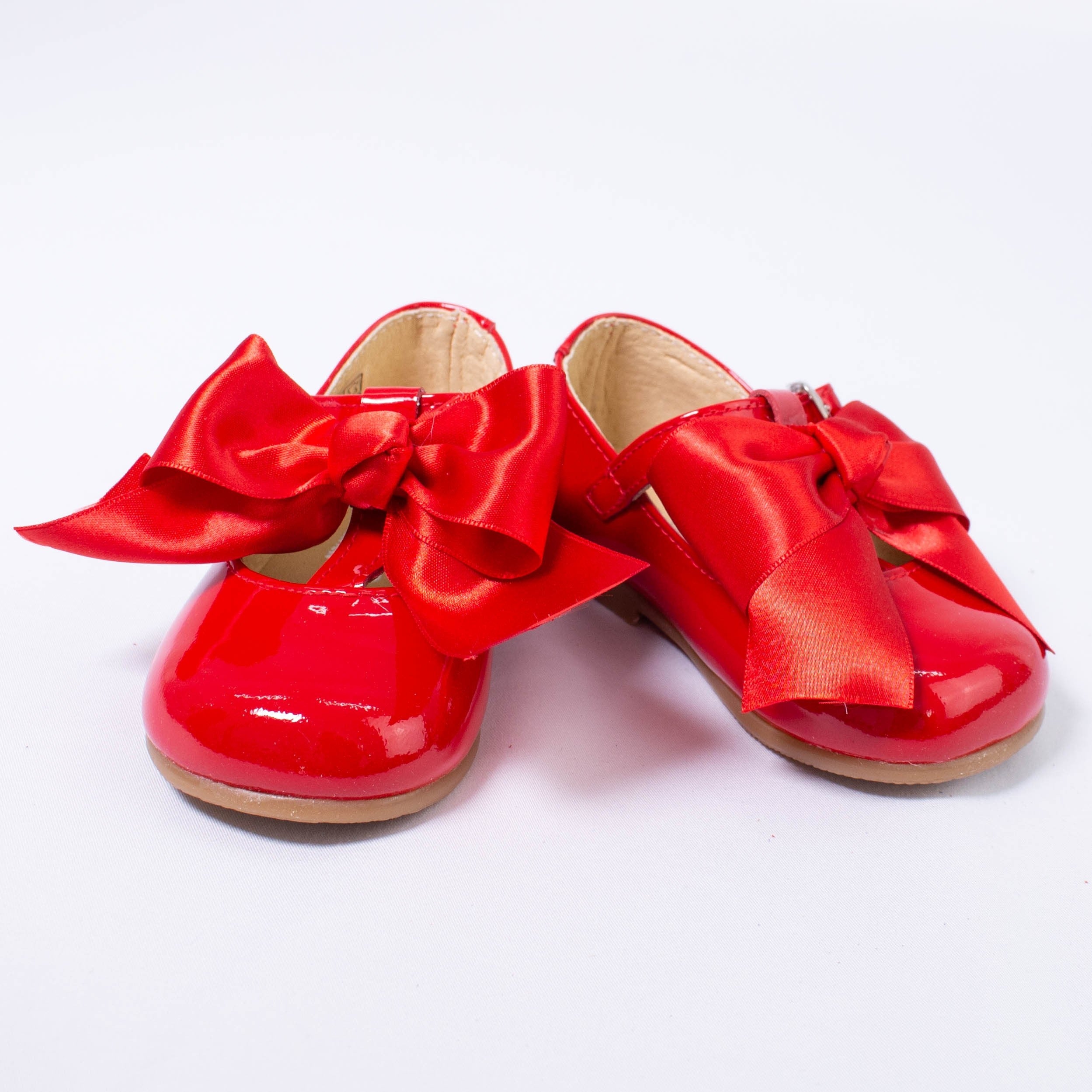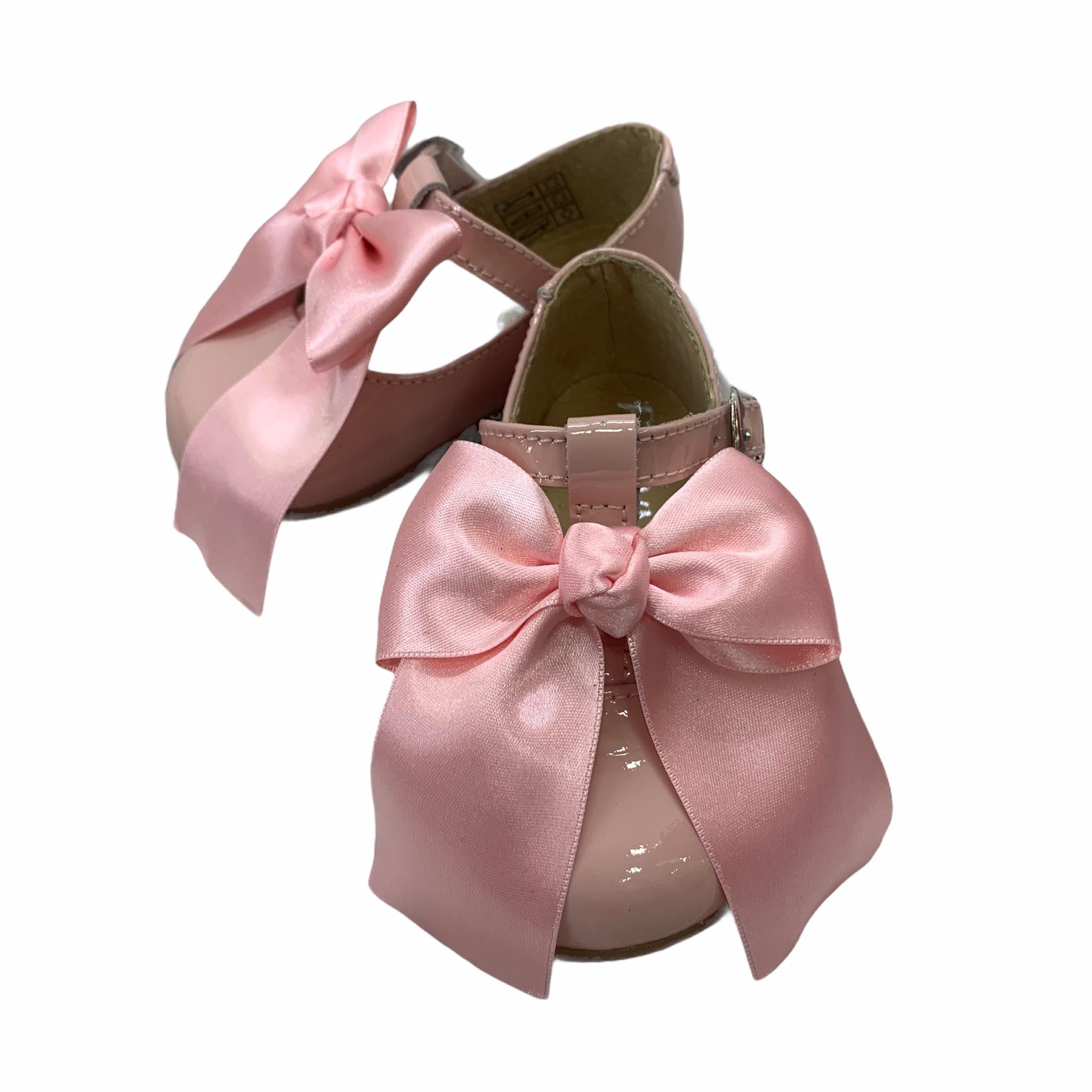 Lacklederschuh mit abnehmbarer Schleife vorne und Riemenverschluss.