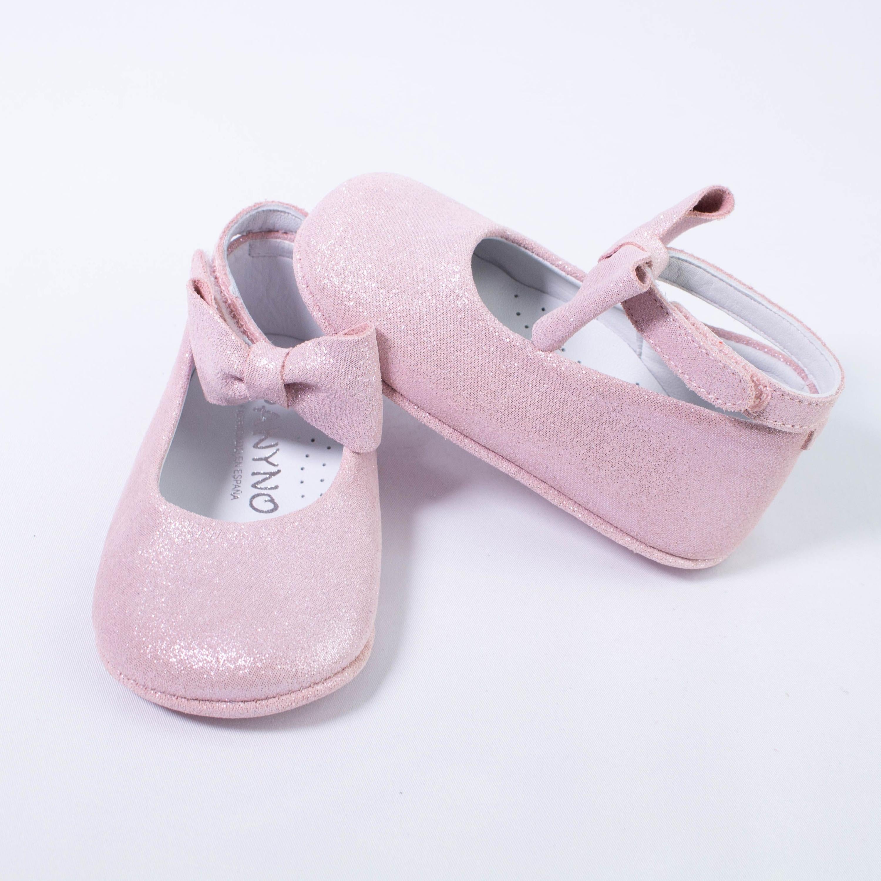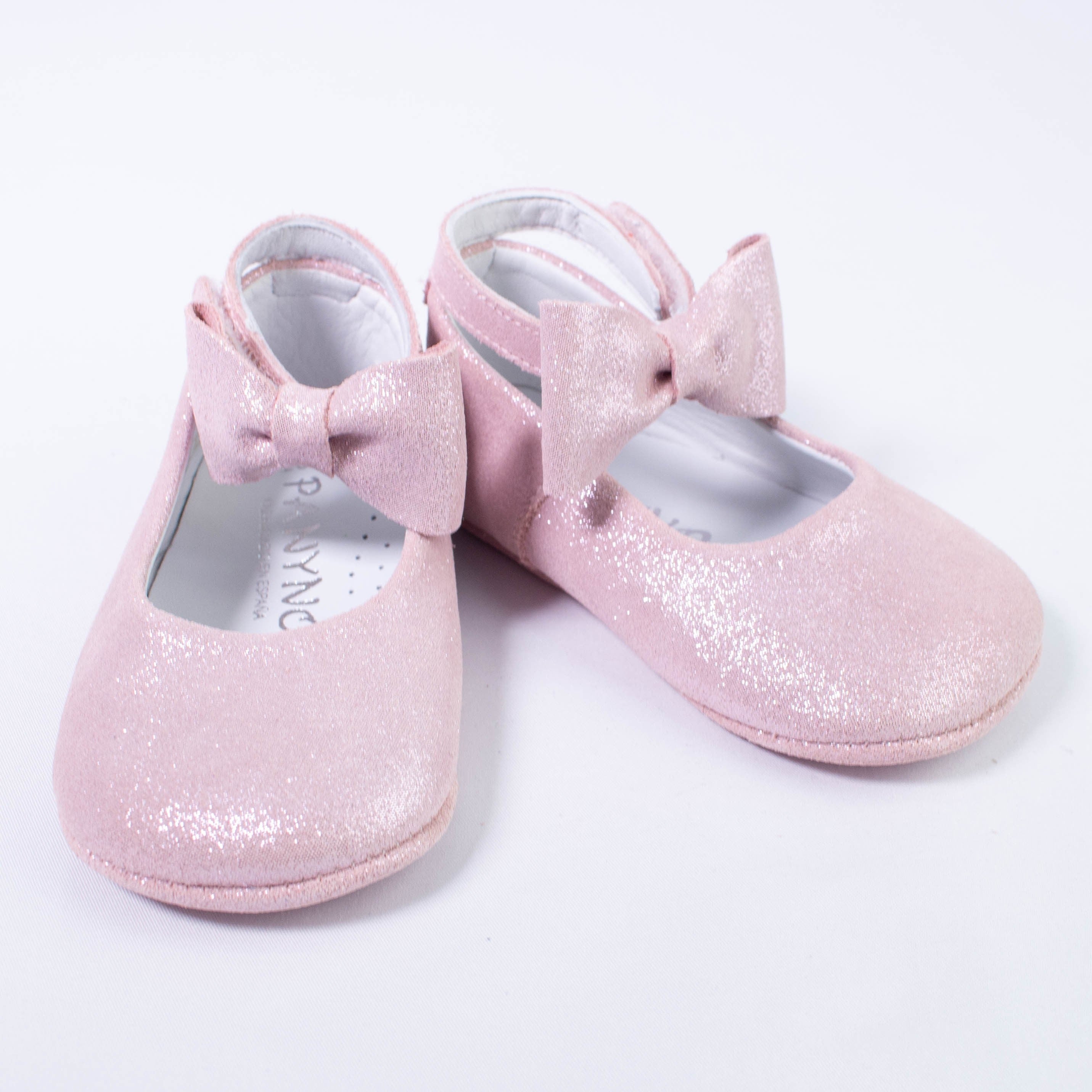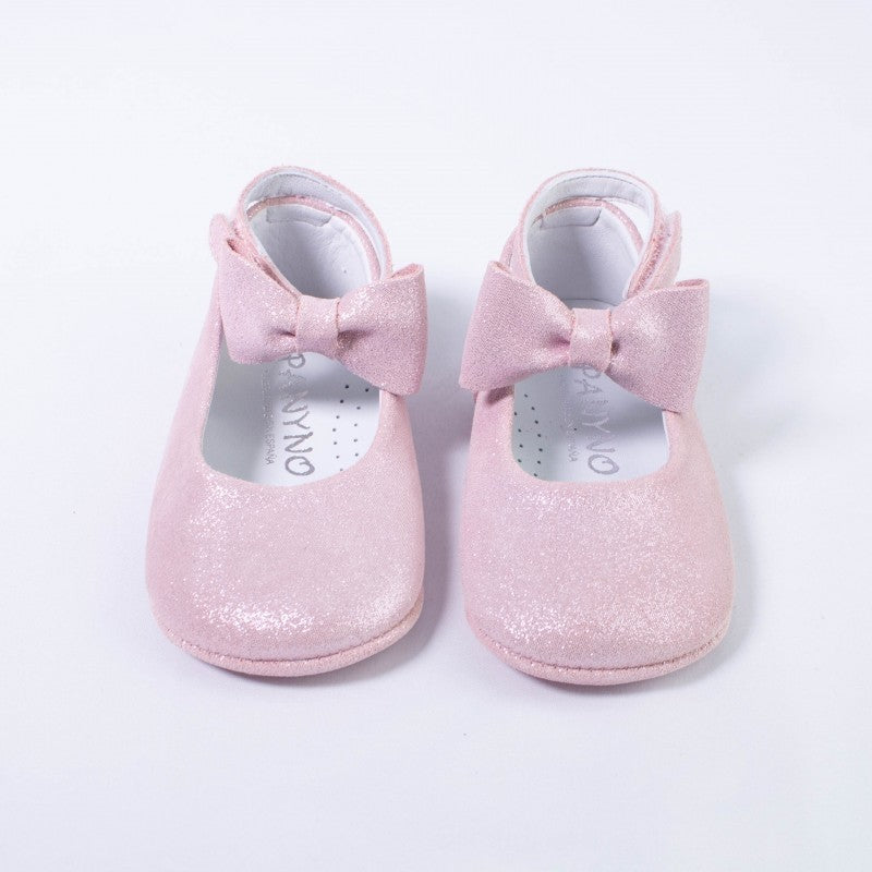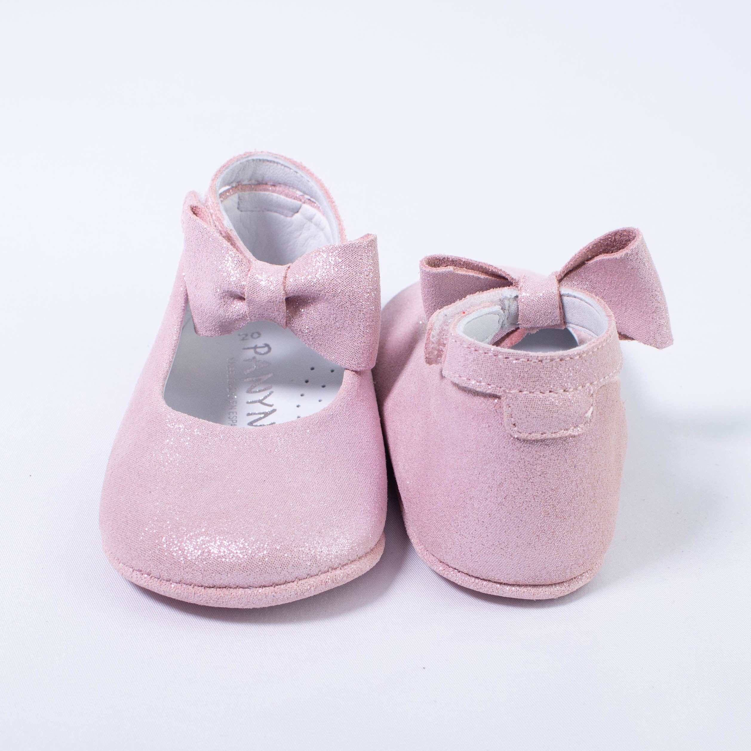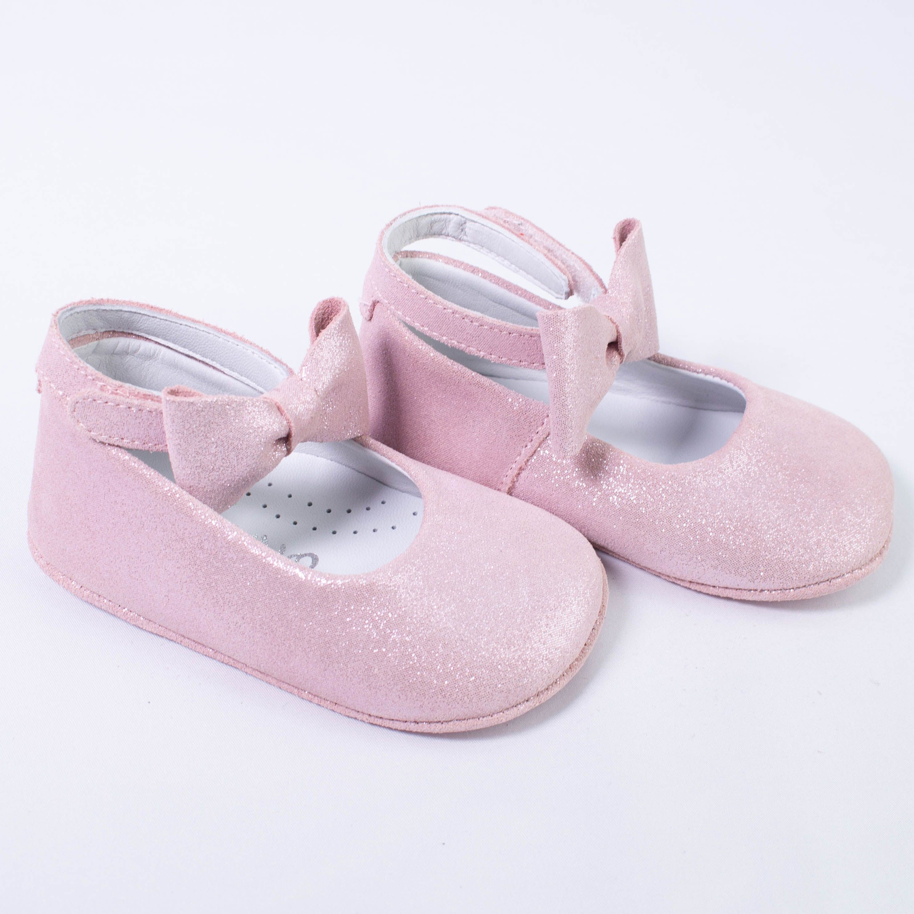 Ballerina Wiegenschuhe mit rosa Schleife und lila Glitzer. Klettverschluss.