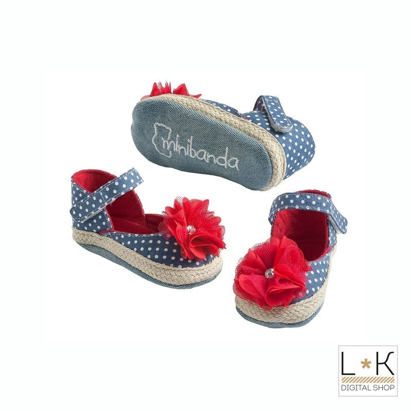 Babyschuhe aus bli-Stoff mit weißen Tupfen, mit Riemen und Blumenapplikation aus rotem Tüll oben.