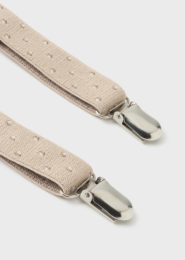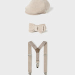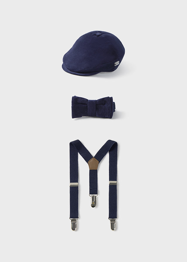 Il set perfetto per un look elegante e sofisticato per neonati. Il cappello modello coppola e il papillon in morbido velluto aggiungono un tocco di stile, mentre le bretelle elastiche con microfantasia garantiscono comfort e praticità. Completa il look dei tuoi piccoli con gusto e raffinatezza.