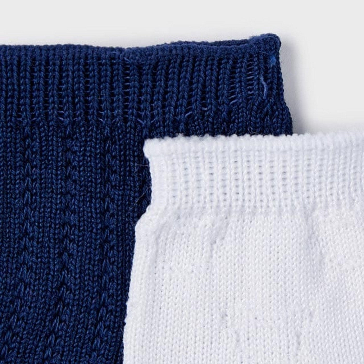Zwei Paar kurze Socken, ein weißes und ein blaues, aus Baumwolle mit Teddybär-Perforationen.
