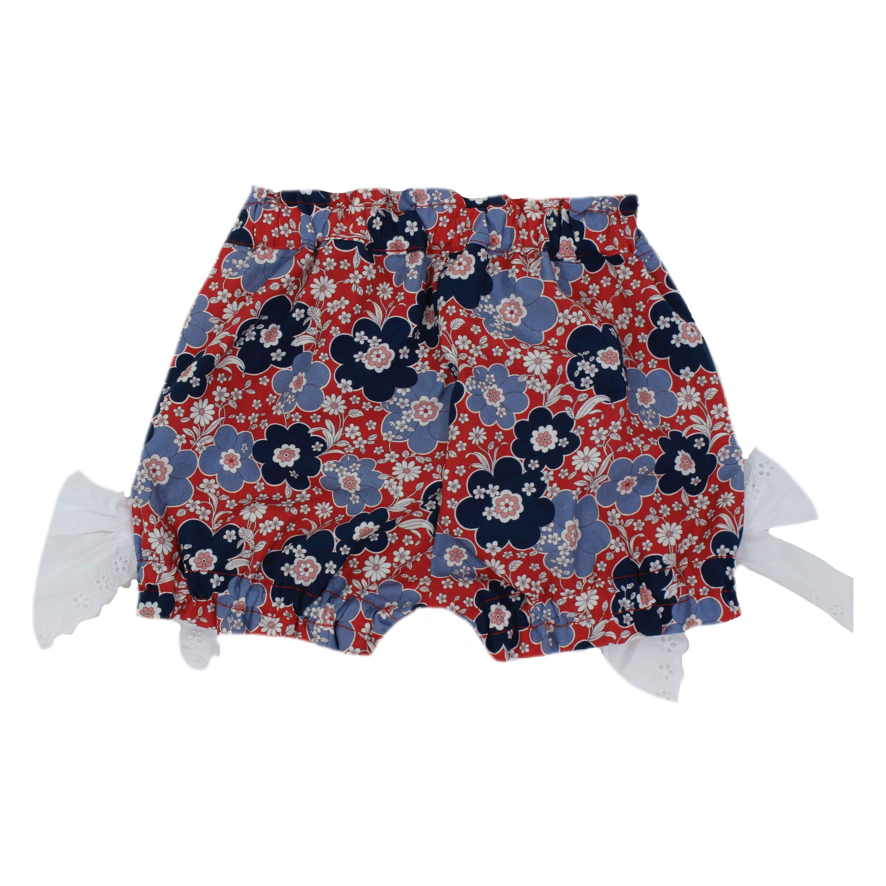 Baumwollshorts mit Blumenmuster, seitlichen Schleifen aus San Gallo-Spitze, Seitentaschen und elastischem Bund.