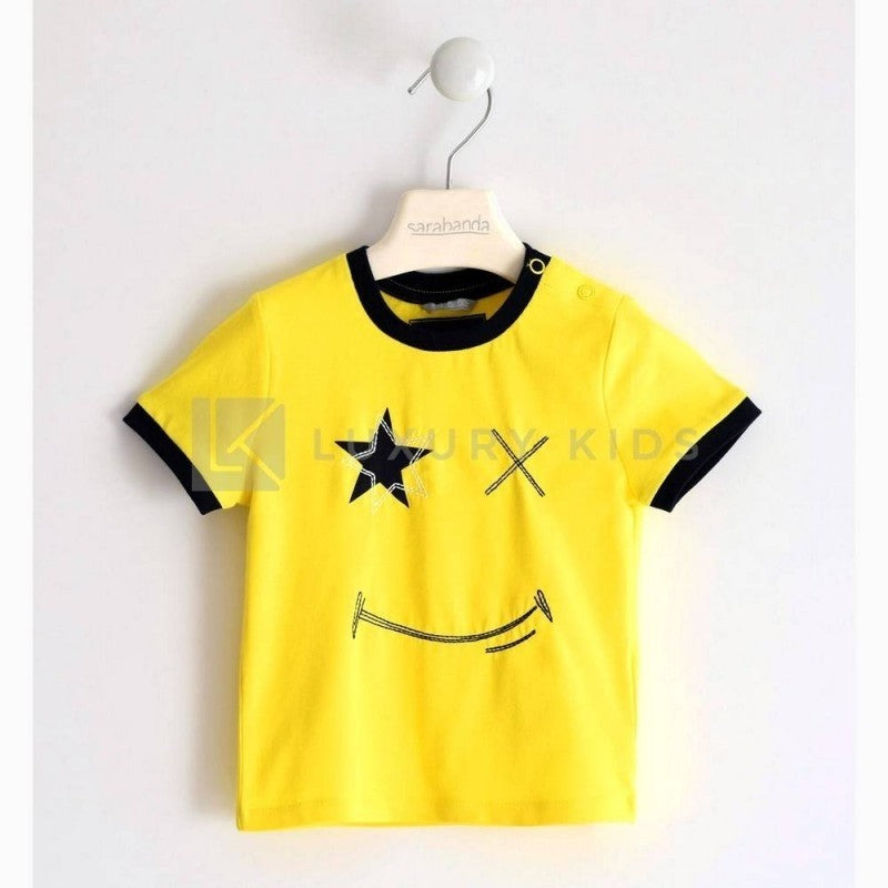 Schönes Sarabanda T-Shirt aus frischem Stretch-Baumwolljersey. Das Modell ist mit elastischen Rippen an den Bündchen und am Rundhalsausschnitt versehen. Öffnung mit Druckknöpfen an der Schulter bis Größe 3 Jahre