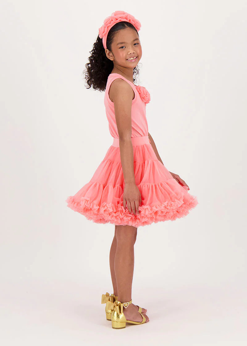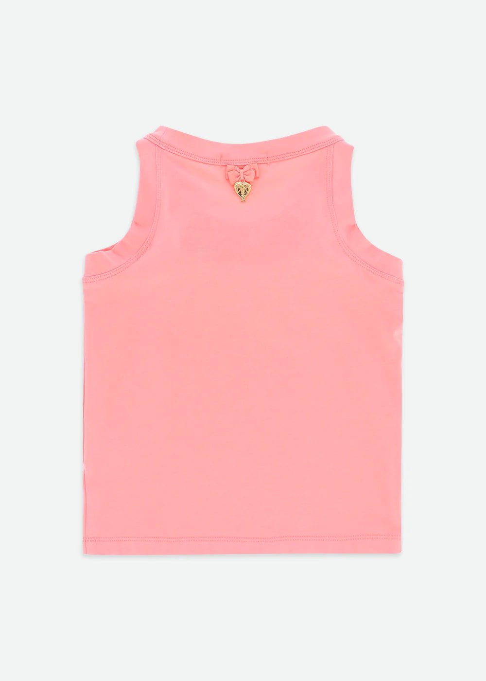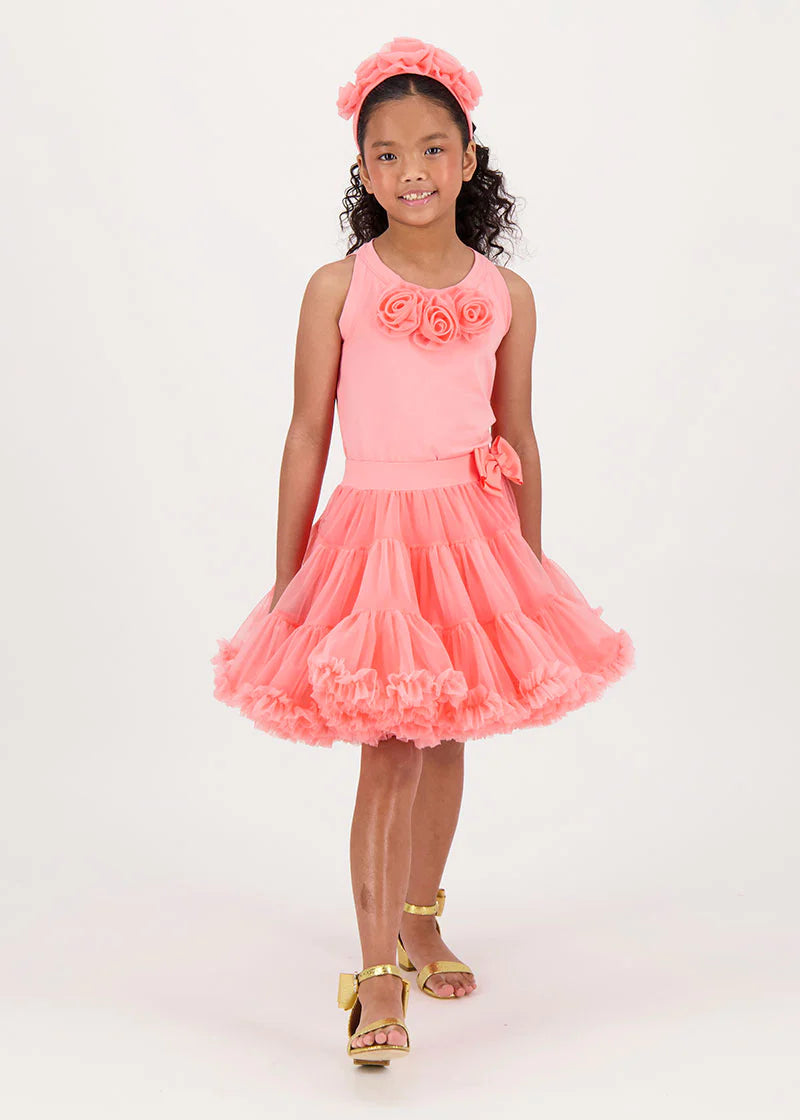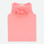 Top estivo grazioso e giocoso in corallo. Dettagliato con rose di tulle sul davanti e caratterizzato dal nostro caratteristico fiocco e ciondolo a cuore dorato sul retro. Questo grazioso top è liscio sulla pelle, realizzato nel nostro misto cotone più morbido. Vestibilità facile da indossare.