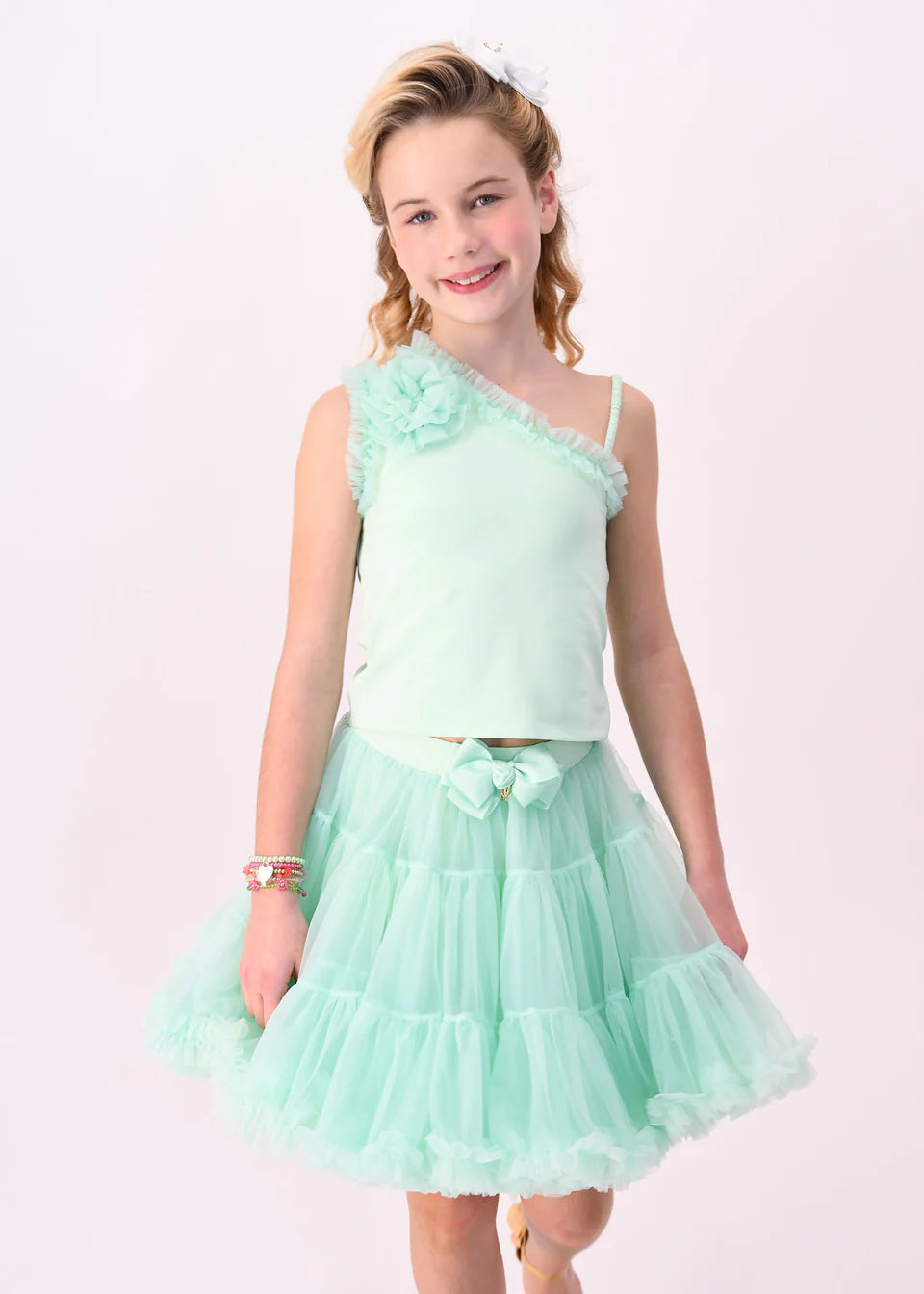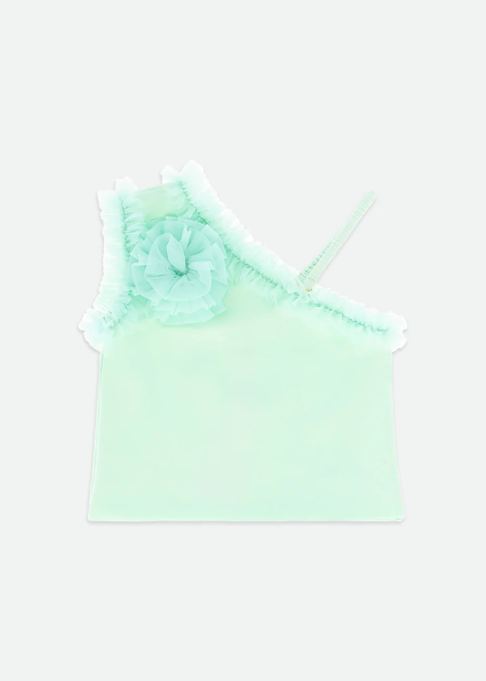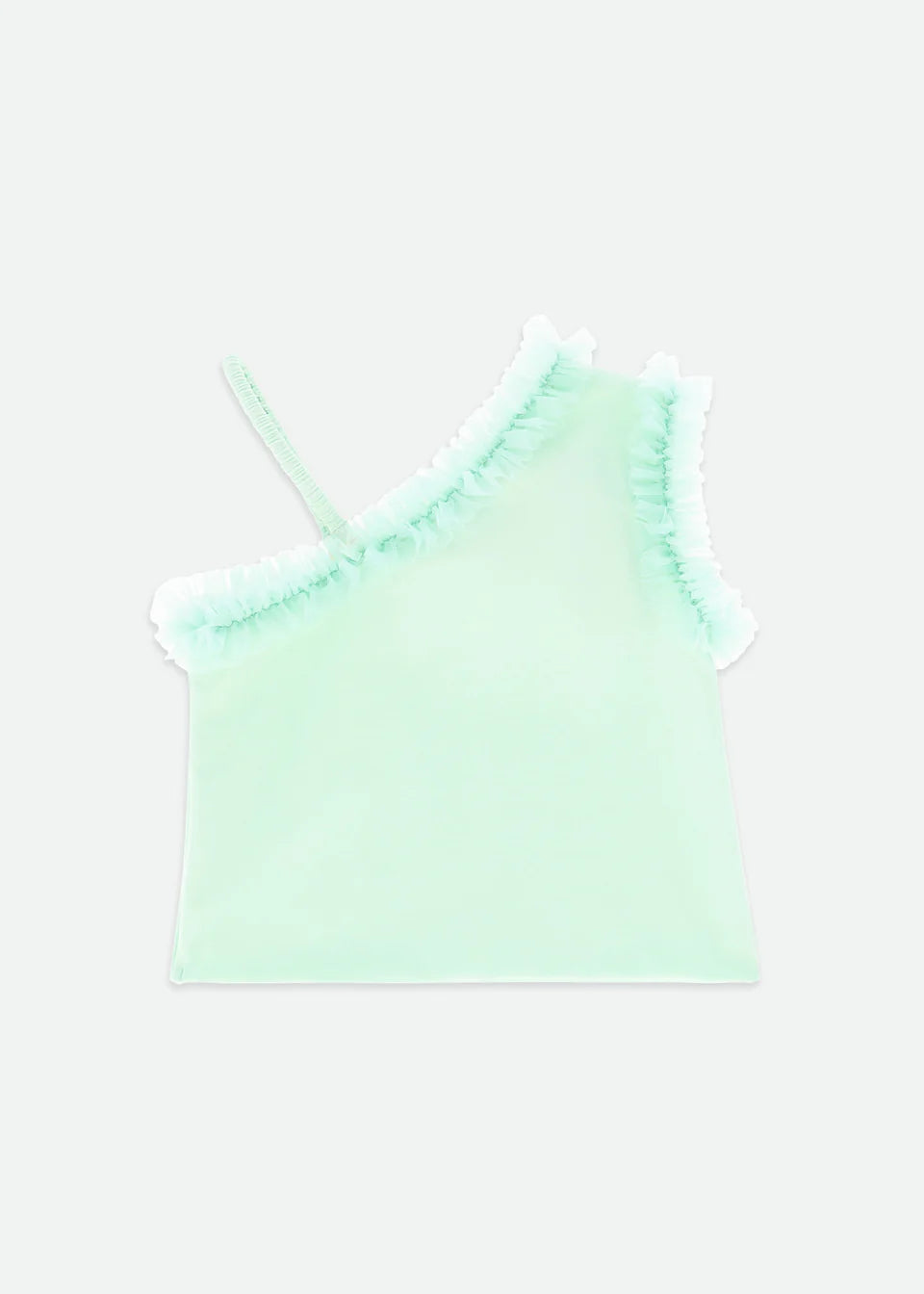 Il guardaroba estivo di ogni bambina ha bisogno di uno o due gilet, o tre. Il nostro gilet in jersey di cotone color menta è la scelta perfetta con la sua forma asimmetrica e la spallina discutibile. Sul davanti c'è una graziosa rosetta in tulle e c'è un bordo in tulle attorno allo scollo e al giromanica.