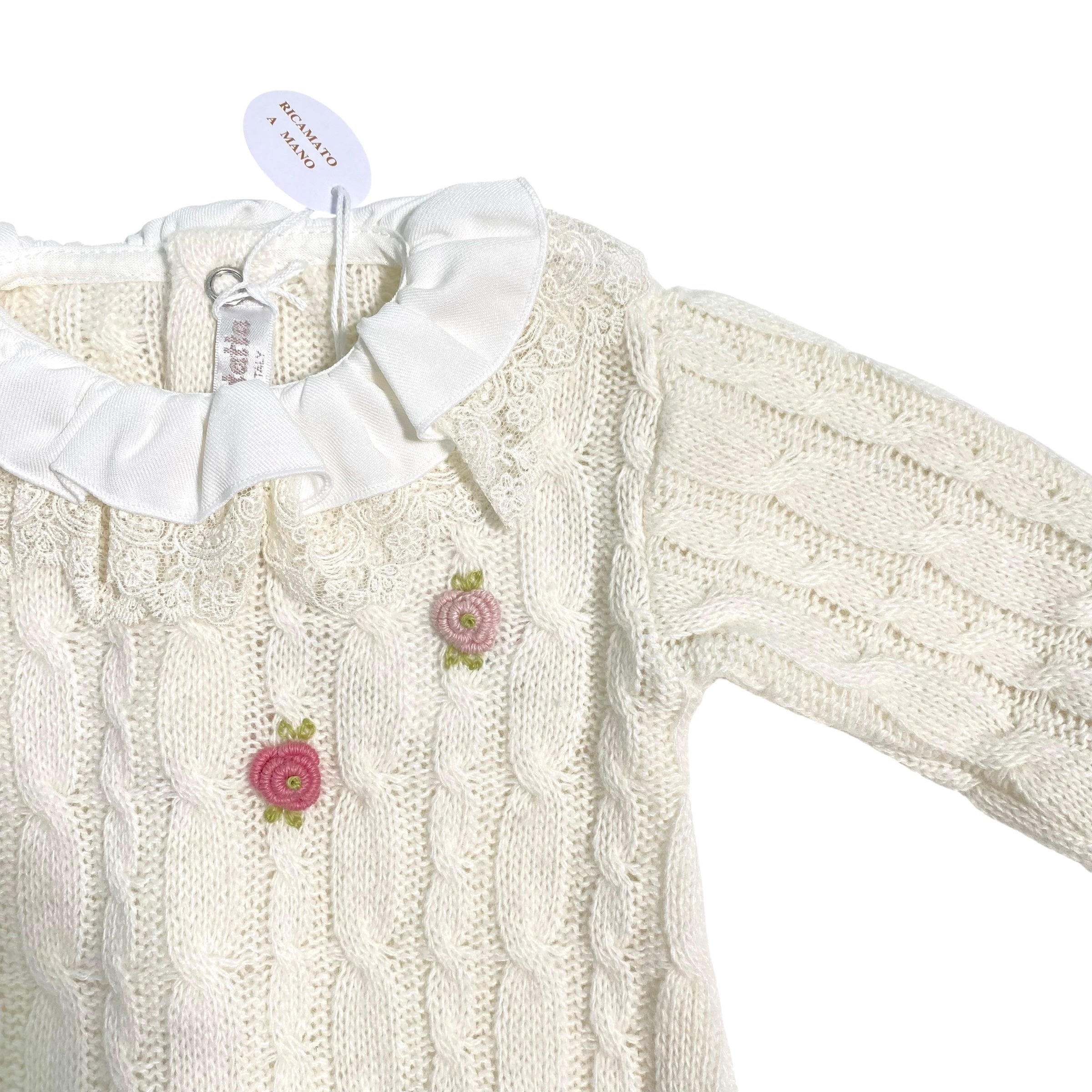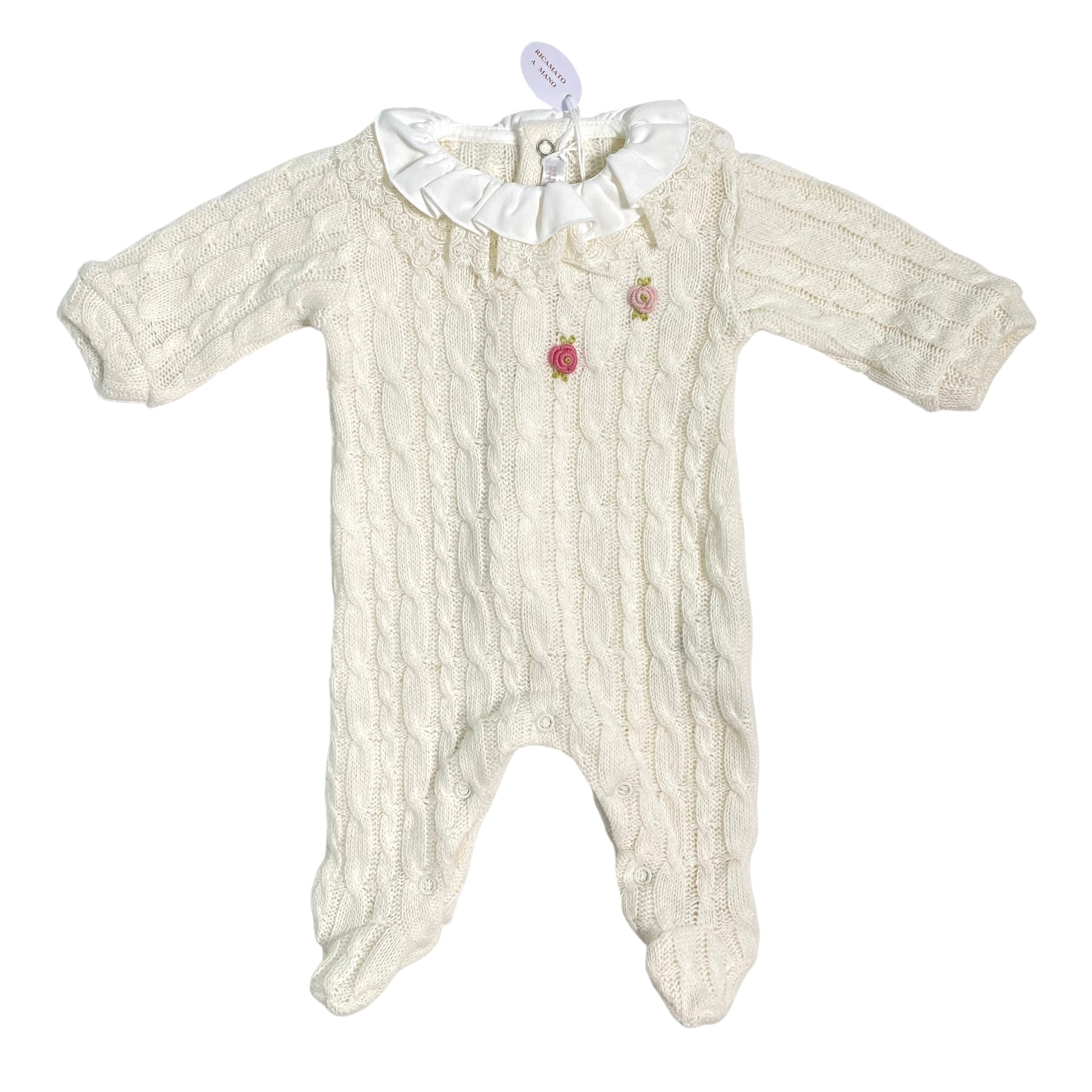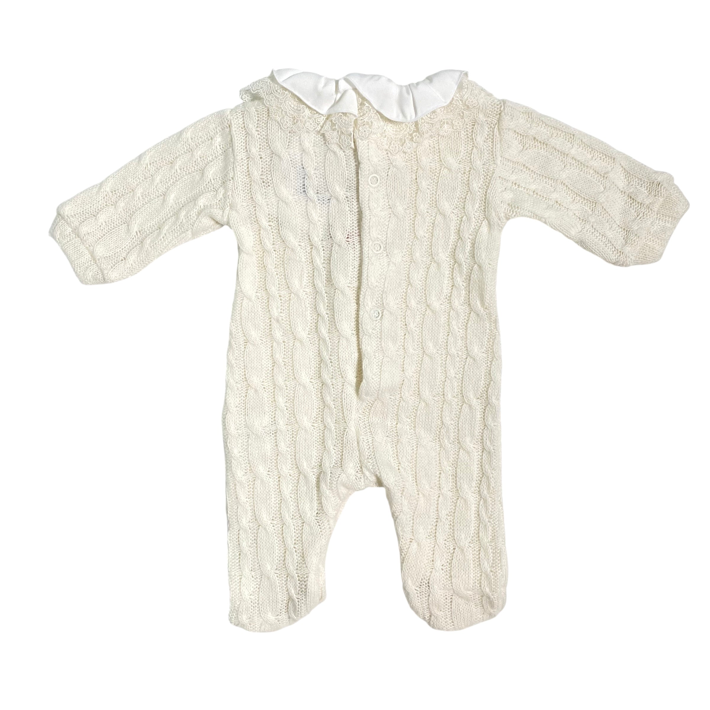 Questa tutina intera in misto lana è ideale per la neonata, unendo comfort e calore naturale grazie alla presenza della lana. I dettagli con trecce e ricami sapientemente realizzati donano un tocco di eleganza classica, perfetta per il corredino e per l’uscita dalla clinica. Morbidezza e traspirabilità assicurano benessere anche per la pelle delicata del bambino, rendendo questo capo un'ottima scelta per i primi giorni di vita.