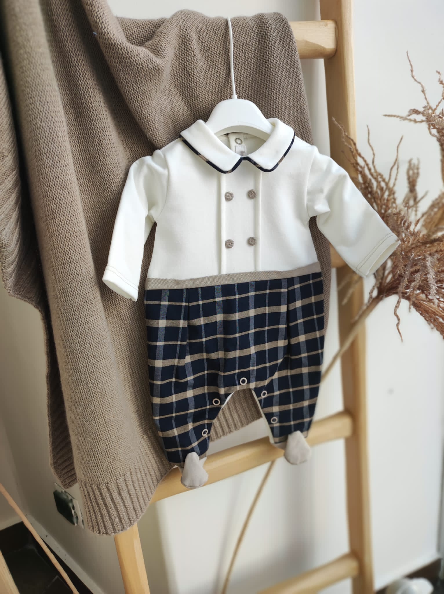 Ganzer Anzug aus warmer Baumwolle mit Oberteil in einfarbigem Creme und darunter mit blauen Karos.