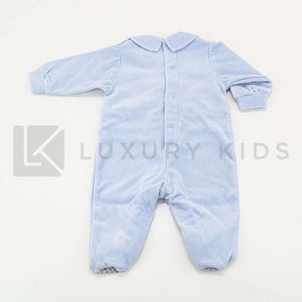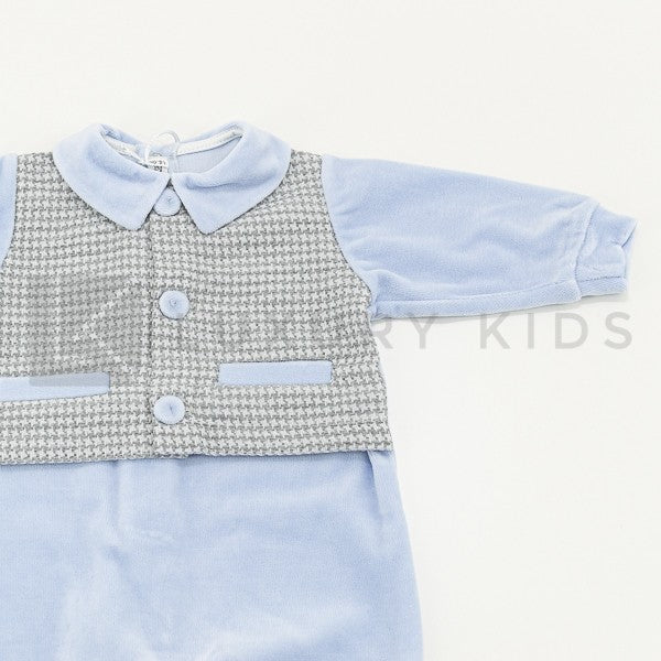 Einteiliger Anzug aus hellblauer Chenille mit Fake-Weste aus grauem Hahnentritt-Wollgemisch.