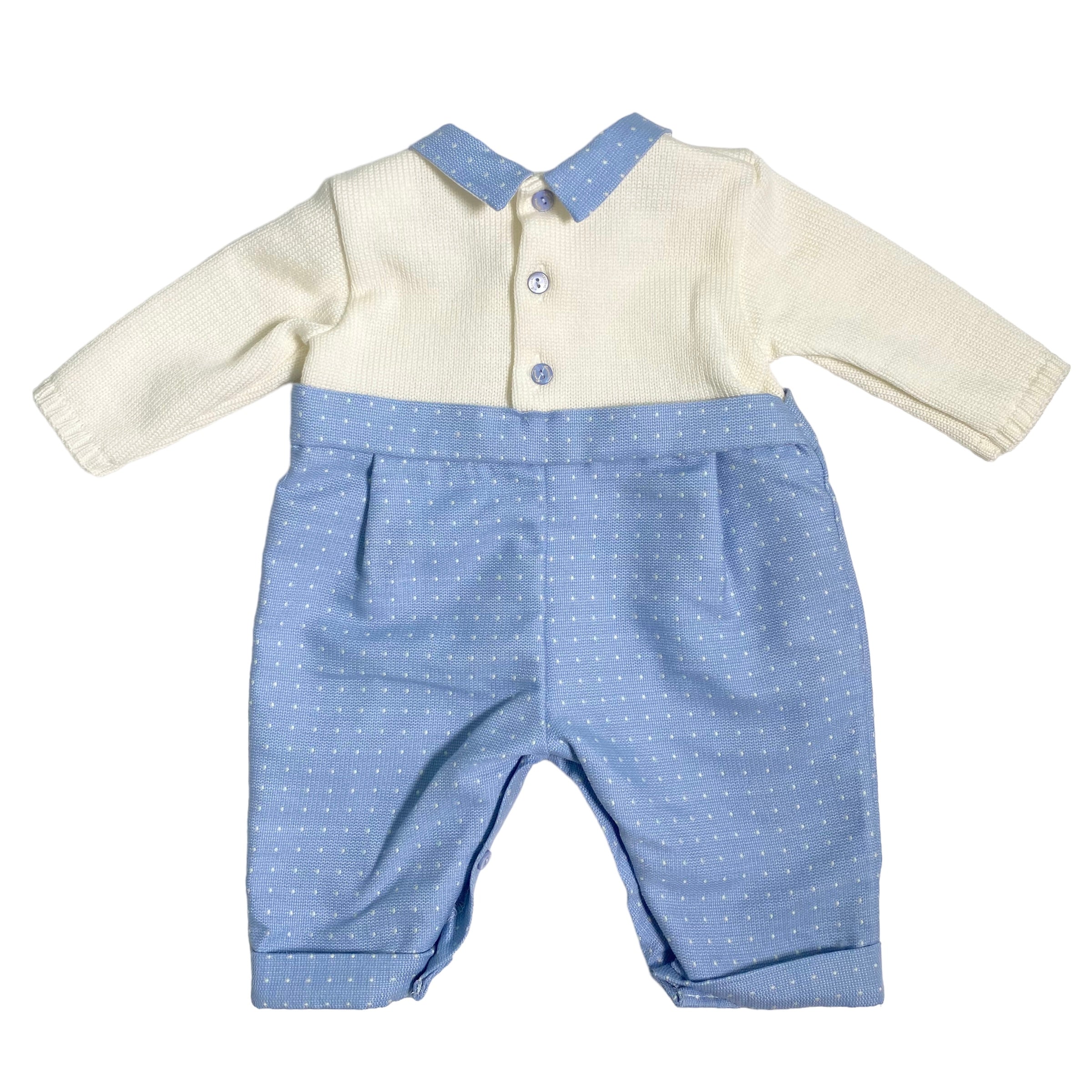 Einteiliger Playsuit mit Oberteil aus cremefarbener Wollmischung und Unterteil aus hellblauem Stoff mit Mikropunkten.