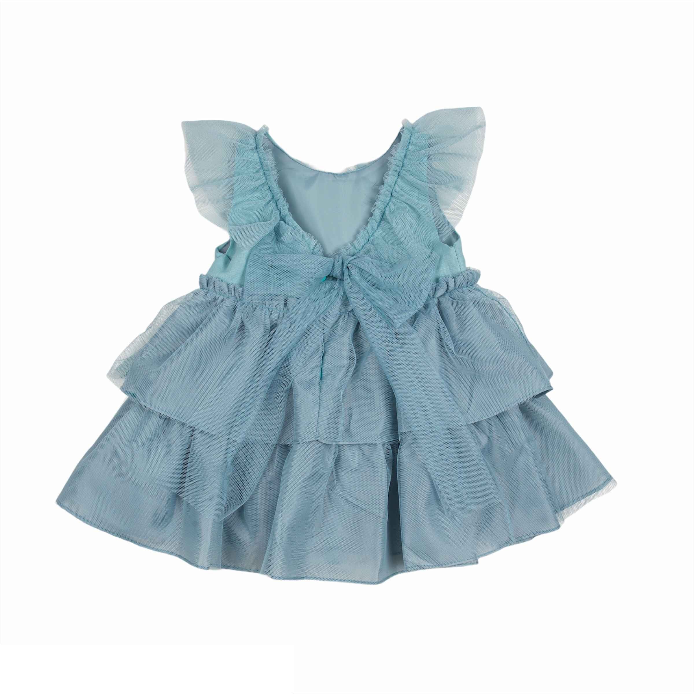 Ärmelloses Kleid. Top aus Leinen mit Tüll am Hals. Unterer Teil aus Baumwolle mit Tüll und Satinvolants. V-Ausschnitt auf der Rückseite. Unsichtbarer Reißverschluss. Schleife aus Tüll auf der Rückseite.