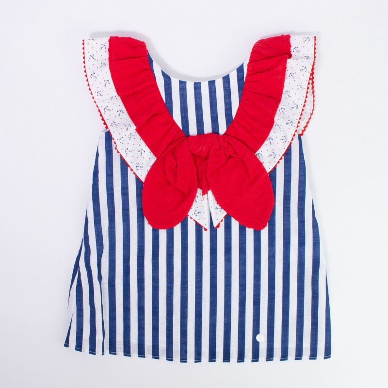 Ärmelloses blaues Baumwollkleid mit weißen Streifen, rotem Plumetis-Stoffband am Oberteil und weißem Baumwollband mit Ankern und roter Spitze an den Rändern
