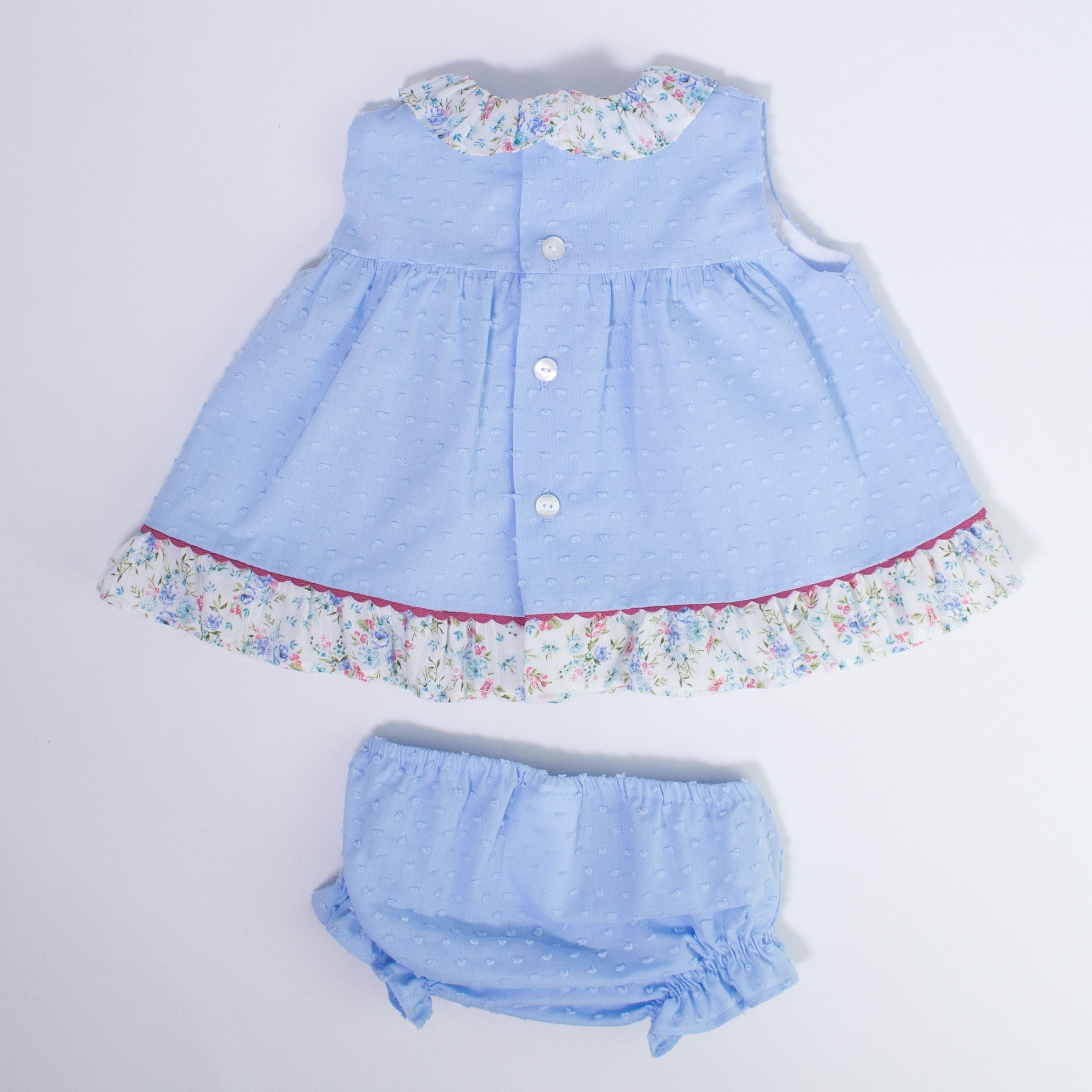 Culottein Plumetis einfarbig himmelblau mit elastischem Bund und Beinen.