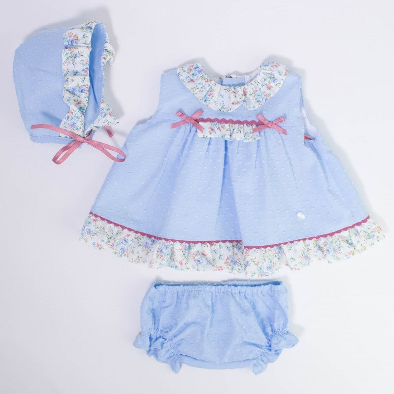 Öffnung auf der Rückseite mit Knöpfen. Hellblaue Baumwollmütze mit floralem Rouche und altrosa Schleife unter dem Kinn.